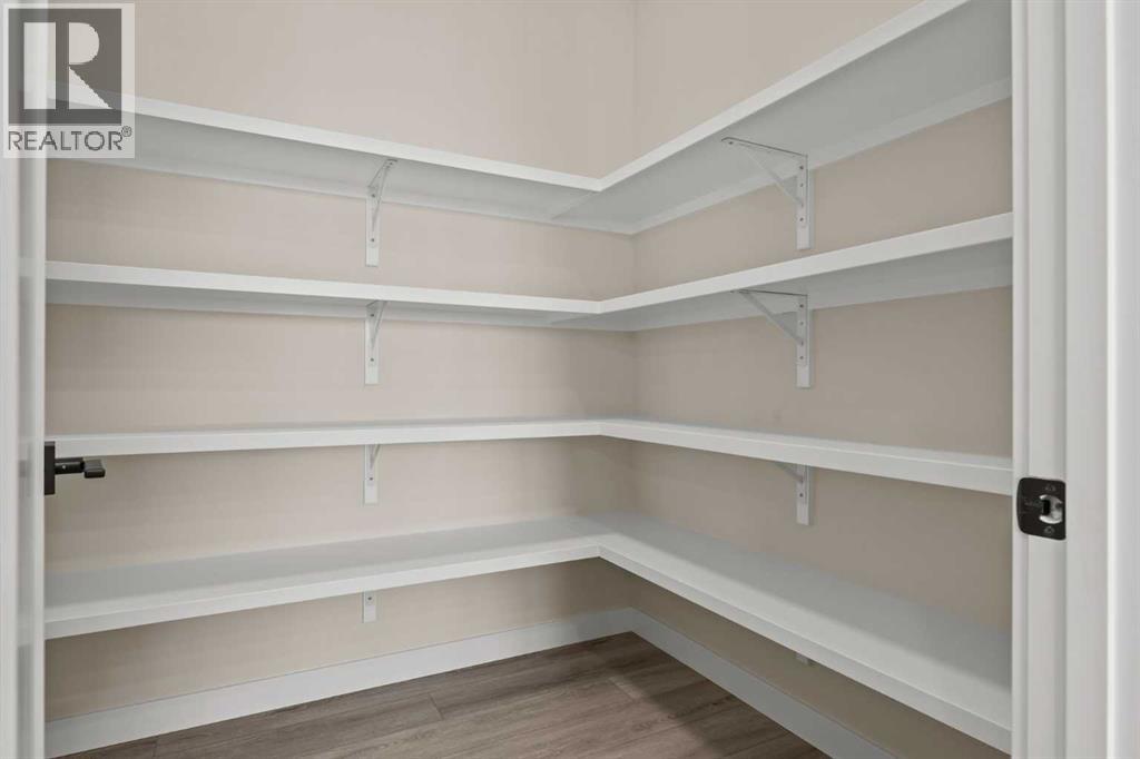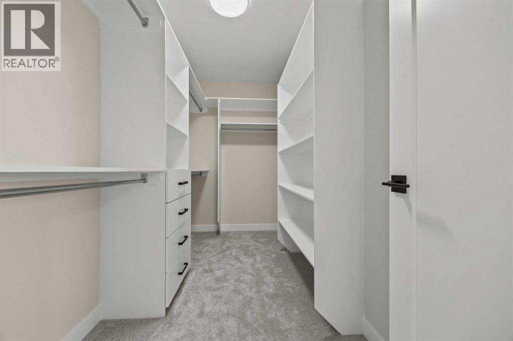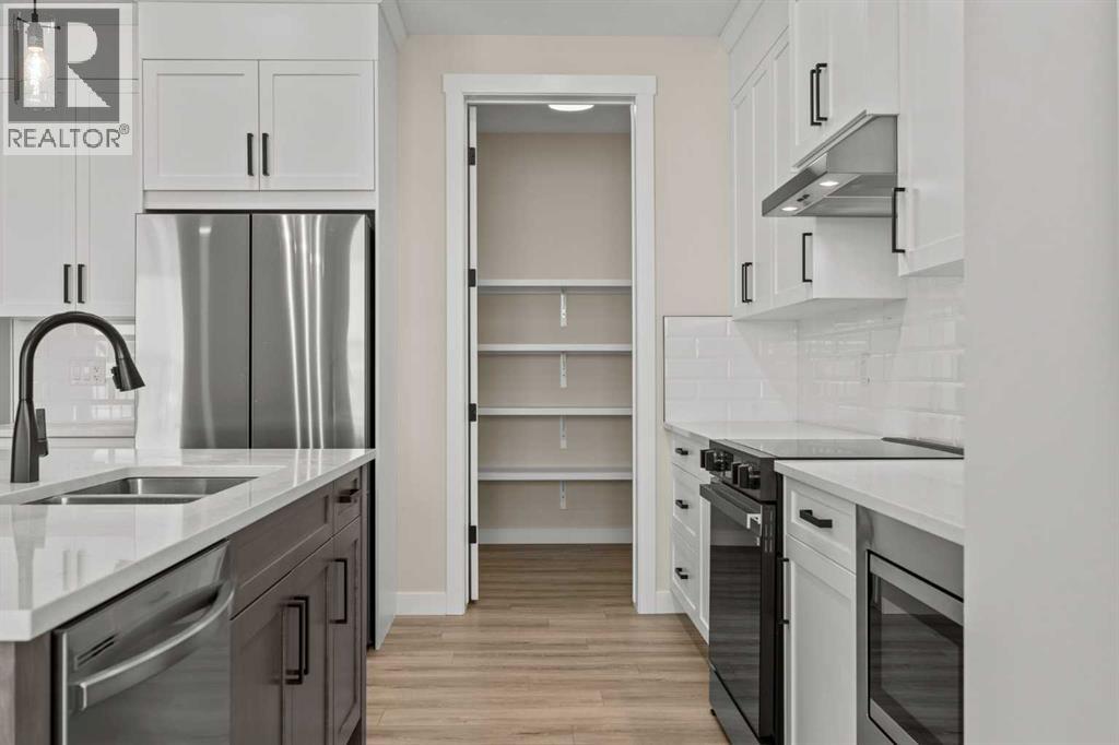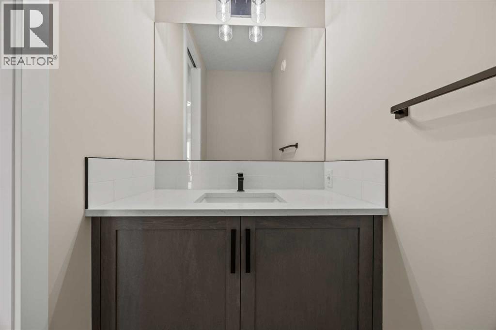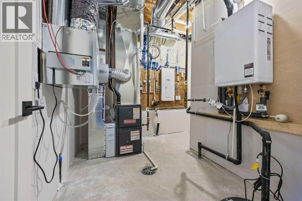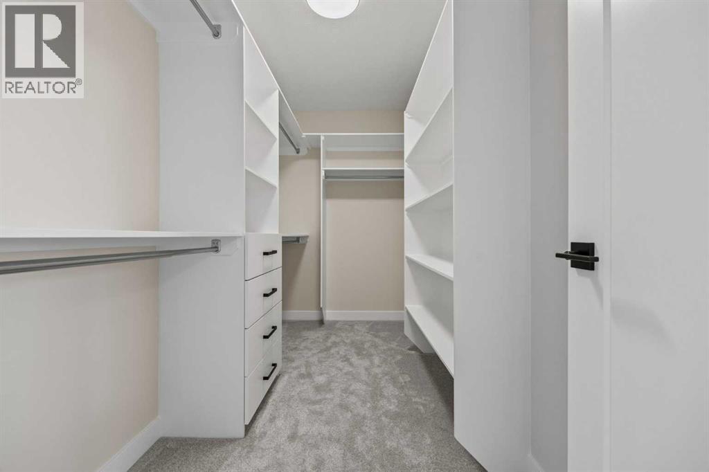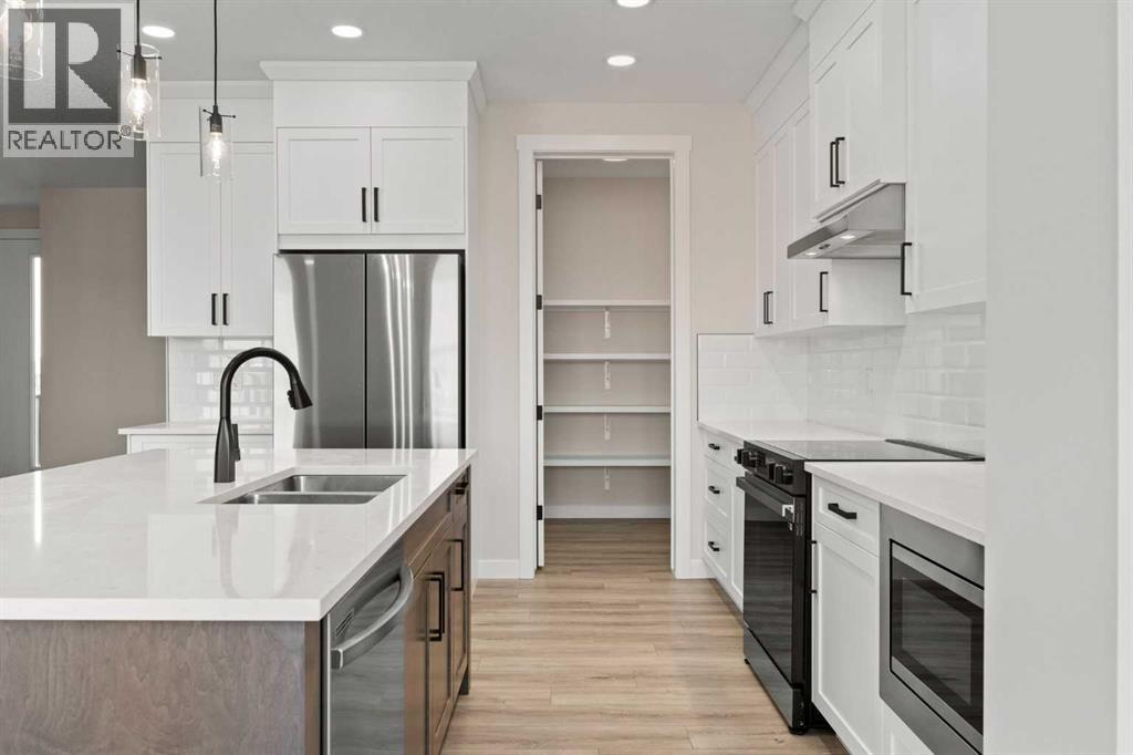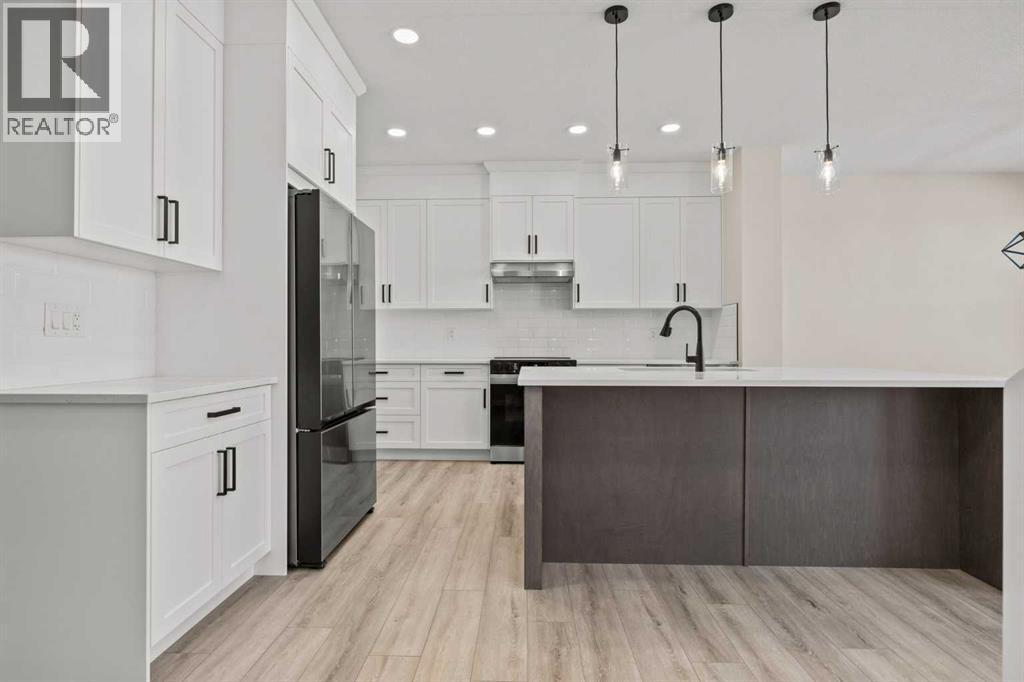 Welcome to 462 Kinniburgh Loop—an elegantly designed 1,840 sq. ft. duplex in the highly sought-after community of Kinniburgh South, Chestermere. Built by award-winning luxury builder Golden Homes, this residence blends modern living, functionality, and timeless design—all just minutes from schools, everyday amenities, and Lake Chestermere.The main floor features an inviting open-concept layout with soaring 9’ ceilings and 8’ doors, creating a spacious and grand feel. As you enter, you’re welcomed by a large 8’ front door with a built-in glass window, setting the tone for the luxury inside. The front of the home includes a convenient half bath, access to your basement, and beautifully finished stairs leading down to the undeveloped basement. This home also includes a side entrance for added flexibility.At the heart of the home is a chef-inspired kitchen boasting a striking two-tone cabinet design, quartz countertops, a large island with breakfast bar seating, ceiling-height painted cabinetry, and sleek stainless-steel appliances. Oversized triple-pane windows flood the living and dining areas with natural light, creating a bright, warm space that’s perfect for entertaining, relaxing, and everyday living. The living room is completed with an electric fireplace featuring multiple color settings and heat modes, adding both style and comfort.Upstairs, the oversized grand staircase with white railings and matte black iron spindles leads you to the luxurious primary bedroom. This bedroom offers a spa-like 5-piece ensuite with a freestanding tub, fully tiled walk-in shower, dual vanities, and an enclosed toilet. The primary bedroom also includes a custom walk-in closet with built-in shelving and organizers, plus stunning sunrise views to start your mornings. Two additional spacious bedrooms and a full bathroom provide plenty of room for family, while the tiled laundry room—complete with a quartz countertop for folding and storage—adds everyday convenience.Premium featur es throughout include an oversized 20’x22’ garage, upgraded spindle railings, MDF shelving, matte black fixtures and hardware, high-efficiency triple-pane windows for energy savings, and an enhanced party wall for superior soundproofing. Golden Homes’ signature quality and craftsmanship are evident in every detail.The exterior will be fully landscaped, including grading, loam, sod to the side entrance, and a front yard tree—offering instant curb appeal and outdoor enjoyment. With its west-facing orientation, you’ll enjoy beautiful sunrises to begin the day and softer evening light to wind down. (id:49203)