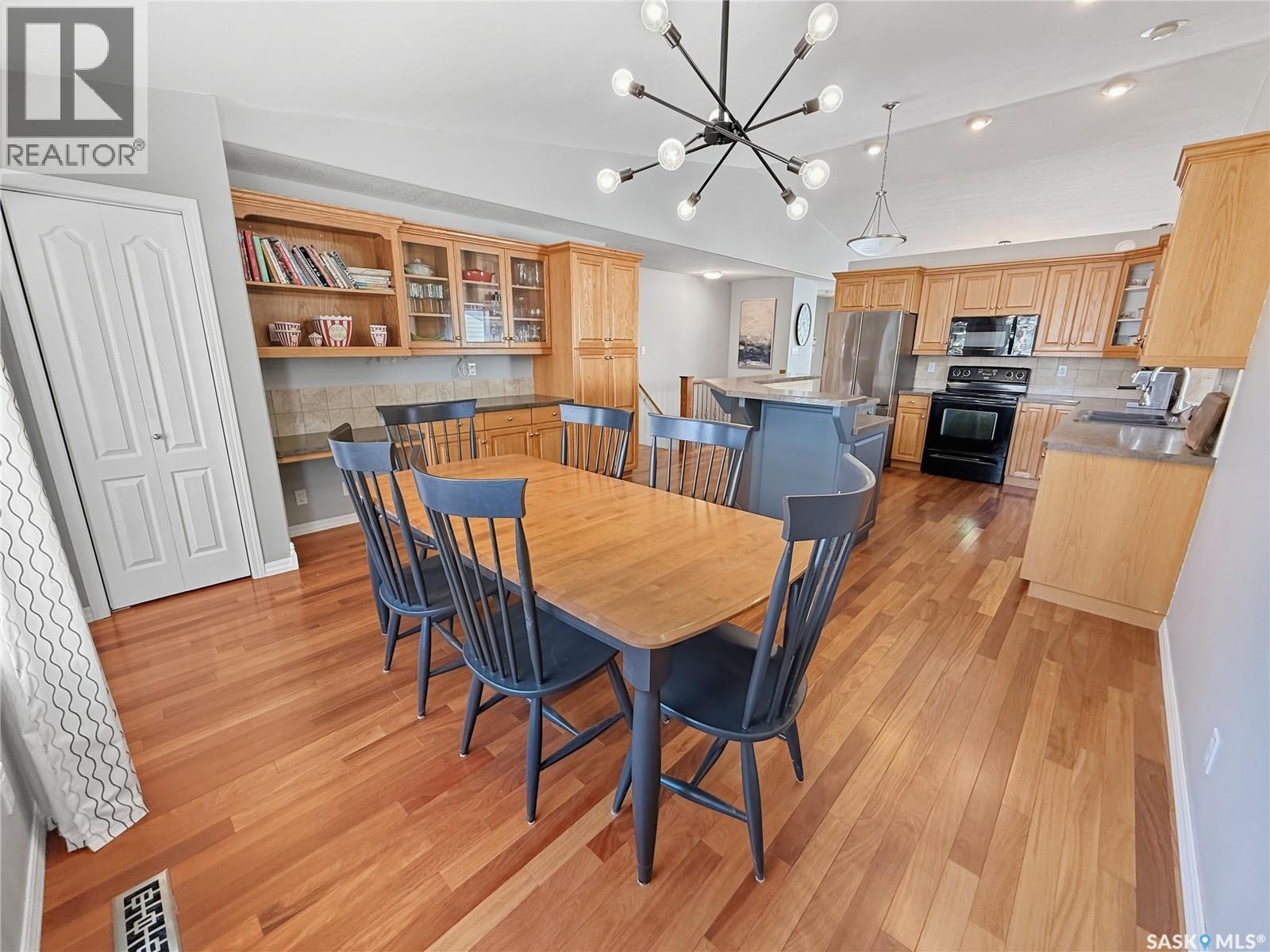 Rare opportunity in Highland. Homes in this sought after subdivision do not come along often. Highland remains one of the city’s most desirable neighbourhoods for families and retirees alike, known for its quiet streets and long term value. This oversized bungalow offers 1,520 sq ft on the main floor with 5 bedrooms, 3 bathrooms, and a heated double attached garage. It checks all the boxes. Step inside to rich hardwood floors, vaulted ceilings, and an open concept layout. The main living areas are finished in a modern grey palette and feature recessed lighting and contemporary light fixtures. The generous living room showcases a statement wall with electric fireplace and TV integration. The spacious foyer includes both a closet and built in drawers, along with direct access to the garage. The kitchen offers solid oak cabinetry, a contemporary grey tiered island with seating, and a stainless steel and black appliance package, including a fridge new in 2025 with water and ice. The dining area includes additional built in cabinetry and a single garden door leading to the east facing deck. Pergola included. The main floor features three bedrooms, including a primary suite with double closets and a 4 piece ensuite complete with jacuzzi tub and corner walk in shower. Two additional bedrooms, a full bath, and a large hallway laundry closet with stacking washer and dryer, washer new in 2026, complete this level. The lower level offers a bright family room with large windows, a spacious bedroom behind double doors, a home gym area, a fifth bedroom, full bath, and utility room with Lennox mid efficient furnace, air exchanger, water softener, central vac, 100 amp panel, and hot water heater replaced July 2023. The fully fenced backyard features an east facing deck, tiered stone landscaping, shed, and gravel RV parking. A well appointed bungalow in Highland with this square footage and layout is a rare offering. Opportunity is knocking. (id:49203)