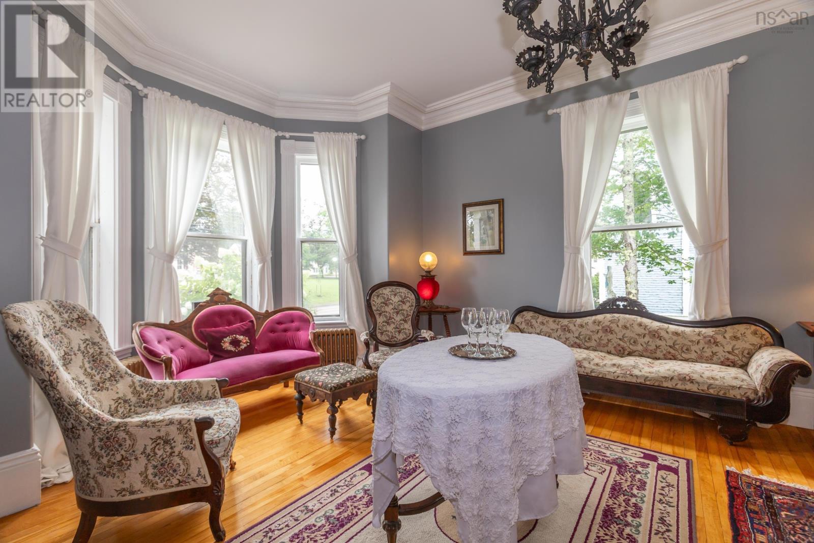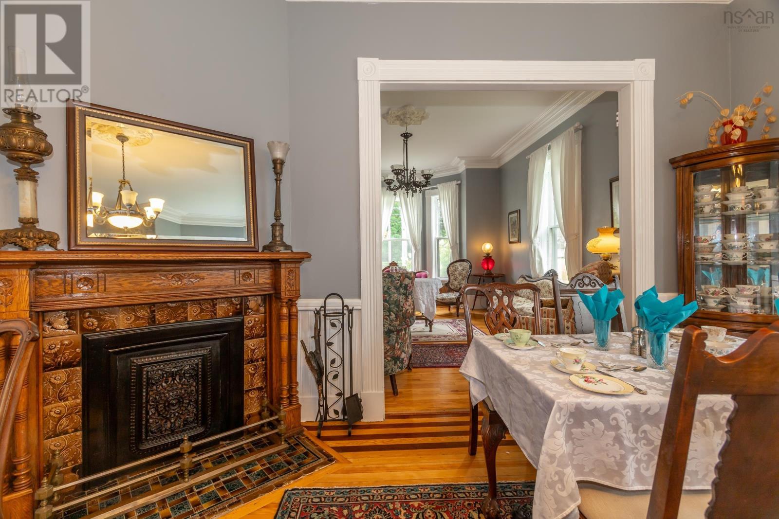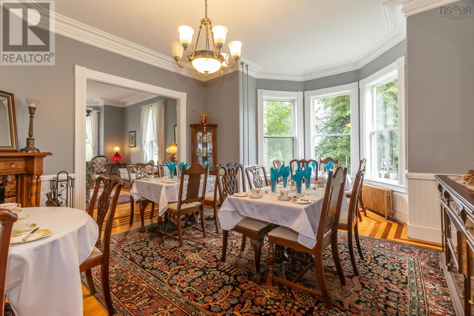 Welcome to the grand Carlisle House Inn, a true gem nestled amongst other stately heritage homes in the Historic District of Annapolis Royal. This captivating property, dating back to 1868, offers a unique blend of timeless elegance and modern comforts. With its rich history and sensitive renovations, this turnkey Bed & Breakfast presents a remarkable opportunity to own a piece of history while enjoying a thriving hospitality business. Located on the main street, the Carlisle House Inn enjoys prime visibility and accessibility, making it a favoured choice for travelers seeking a memorable escape. With a total of nine air-conditioned bedrooms, each featuring its own ensuite, the Inn promises a comfortable and inviting stay. Thoughtfully rejuvenated, with recent updates including fresh interior & exterior paint, plumbing and electrical upgrades, chimney repairs, a newly re shingled roof, a new and efficient furnace, along with updated oil and hot water tanks and professional landscaping. Outstanding features include luxury antique furnishings throughout, the towering turret, high ceilings, grand sweeping staircase, fireplaces and gleaming birch & walnut flooring. The Inn's Victorian dining room is a time capsule of elegance. With white linen, antique tea cups, and a refined atmosphere, it provides the perfect backdrop for serving traditional Afternoon Tea, popular with guests, locals and visitors. The property boasts a versatile garage/carriage house that beckons artists and creatives. Set in the waterfront town of Annapolis Royal, with its plentiful amenities and attractions, including hospital, school, shops, restaurants, galleries, cafes, pool, famous Farmers Market and Harvest Moon Trail. A unique opportunity for an aspiring innkeeper or a connoisseur of heritage homes who wants an elegant home with income, if desired. SELLER FINANCING AVAILABLE. See video tour and 3D Matterport video. (id:49203)