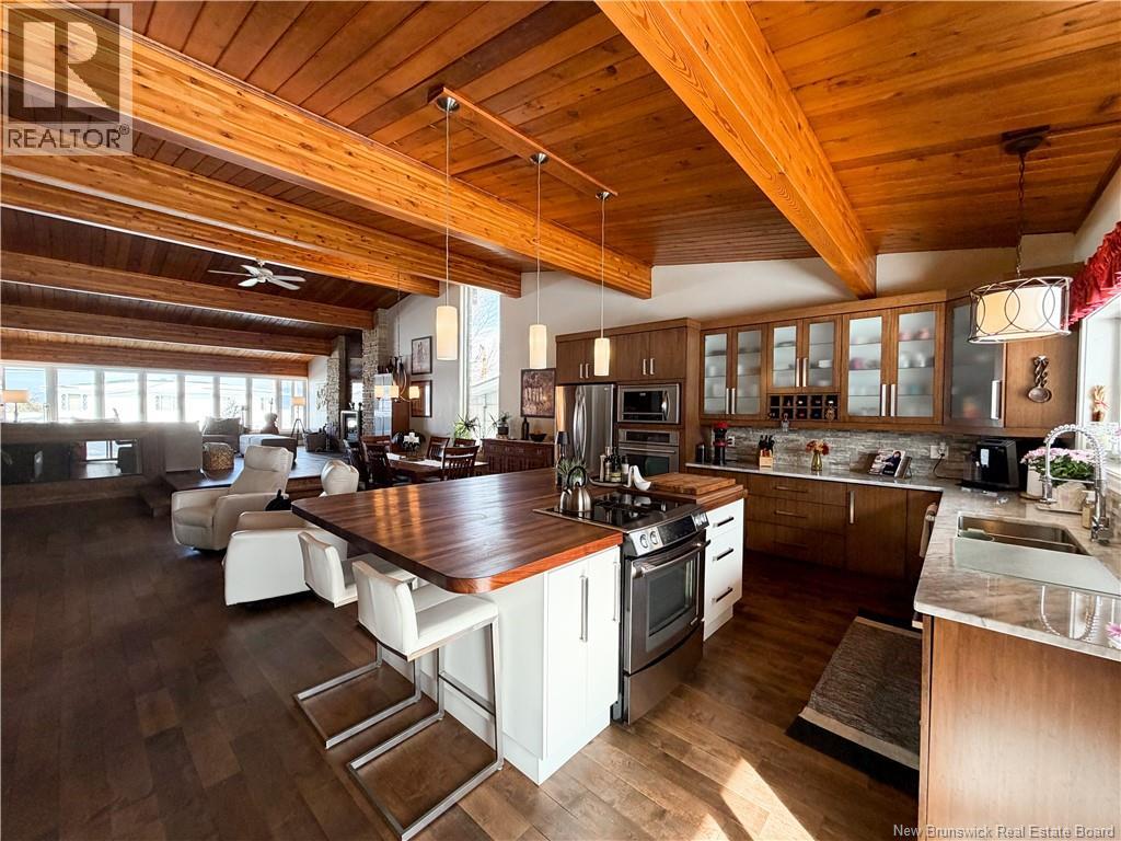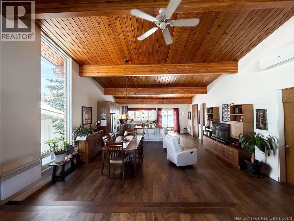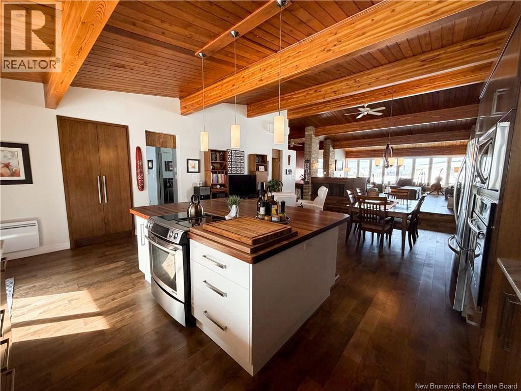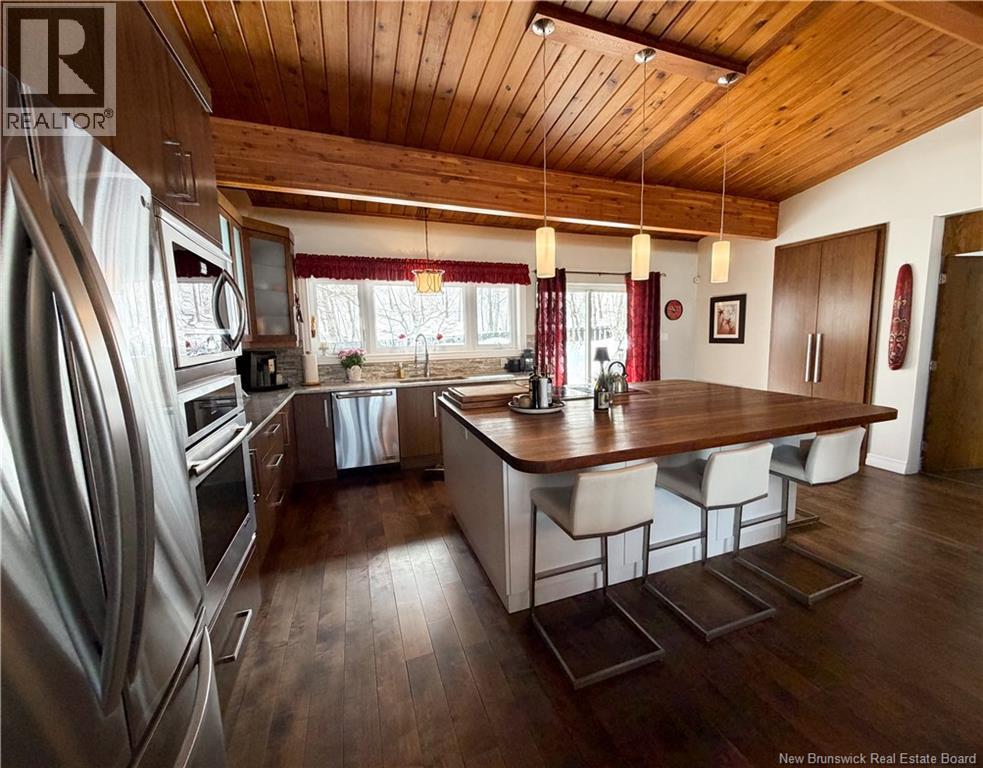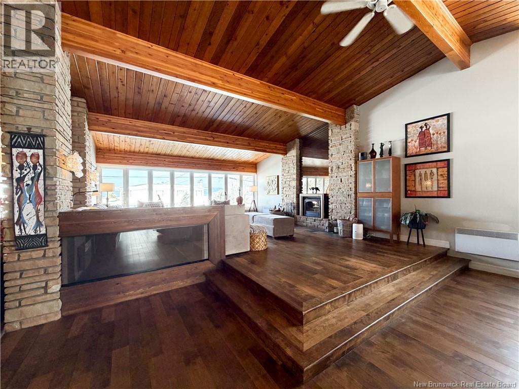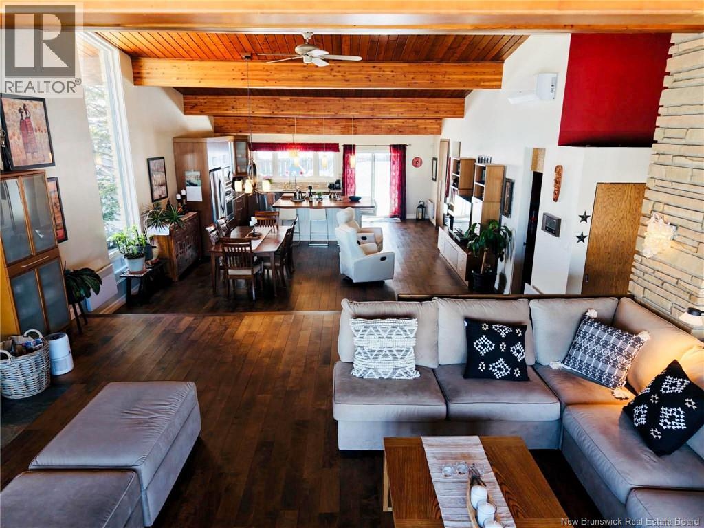 Architect-designed home with a distinctive retro/modern blend, featuring many original vintage details that are still in excellent condition, giving the property a unique character you rarely find today. The home has been very well cared for over the years, reflecting pride of ownership. It also features a flat roof, with the roof and drainage system redone in 2024. Inside, youll find an open-concept layout with beautiful stone and wood finishes that add warmth and style throughout the living spaces. The kitchen is equipped with a large island with a JennAir stove with grill top, ideal for cooking and entertaining. A chefs dream kitchen. The home includes 3 bathrooms and an attached garage that is currently converted into a gathering area to relax and play games. Also convenient for added storage. Located in Atholville, the property with fenced-in backyard sits in a very family-friendly neighbourhood with a park nearby and offers a view of the beautiful Restigouche River. It is also close to the hospital, shopping, and everyday amenities, and only about 6 minutes from schools in Campbellton, making it an ideal location for families or anyone looking for comfort and convenience. (id:49203)
