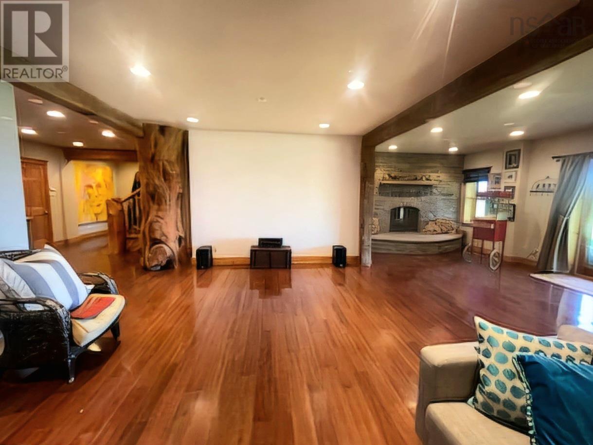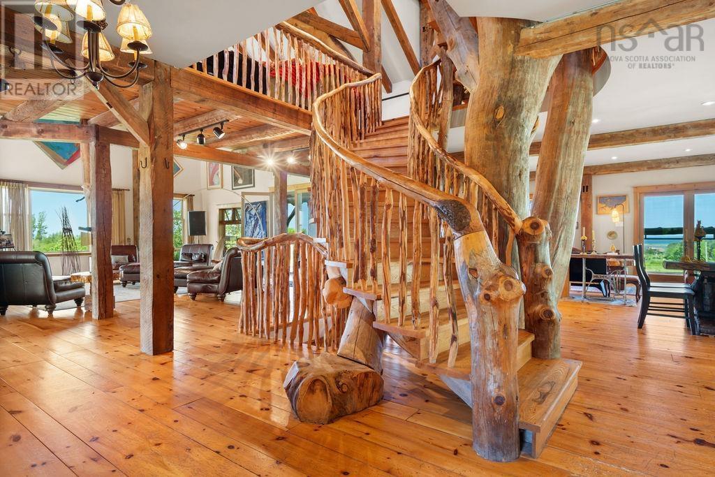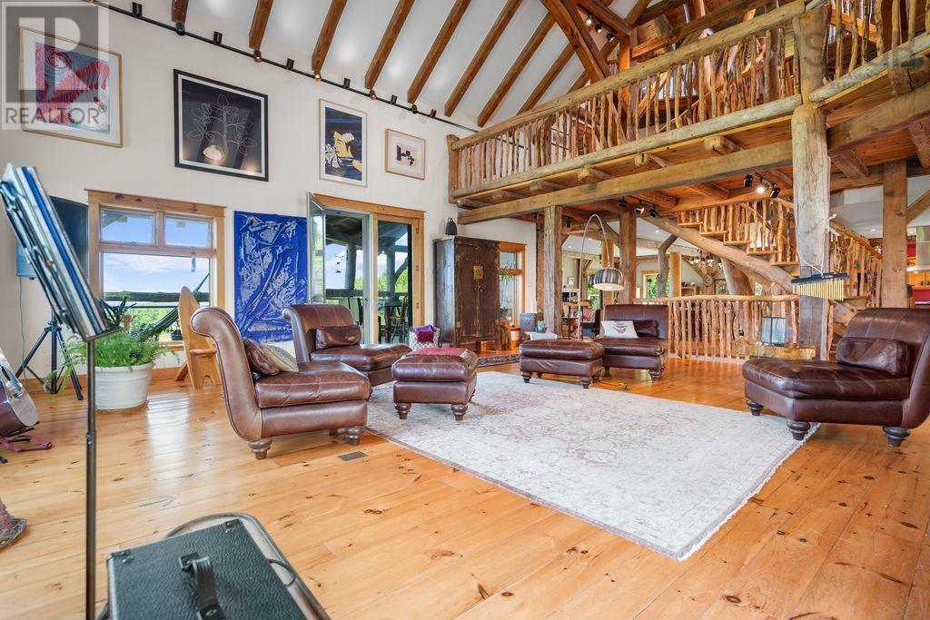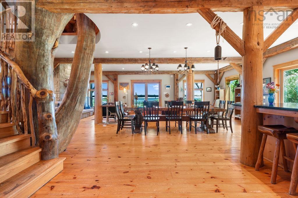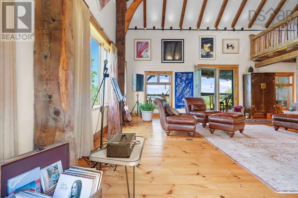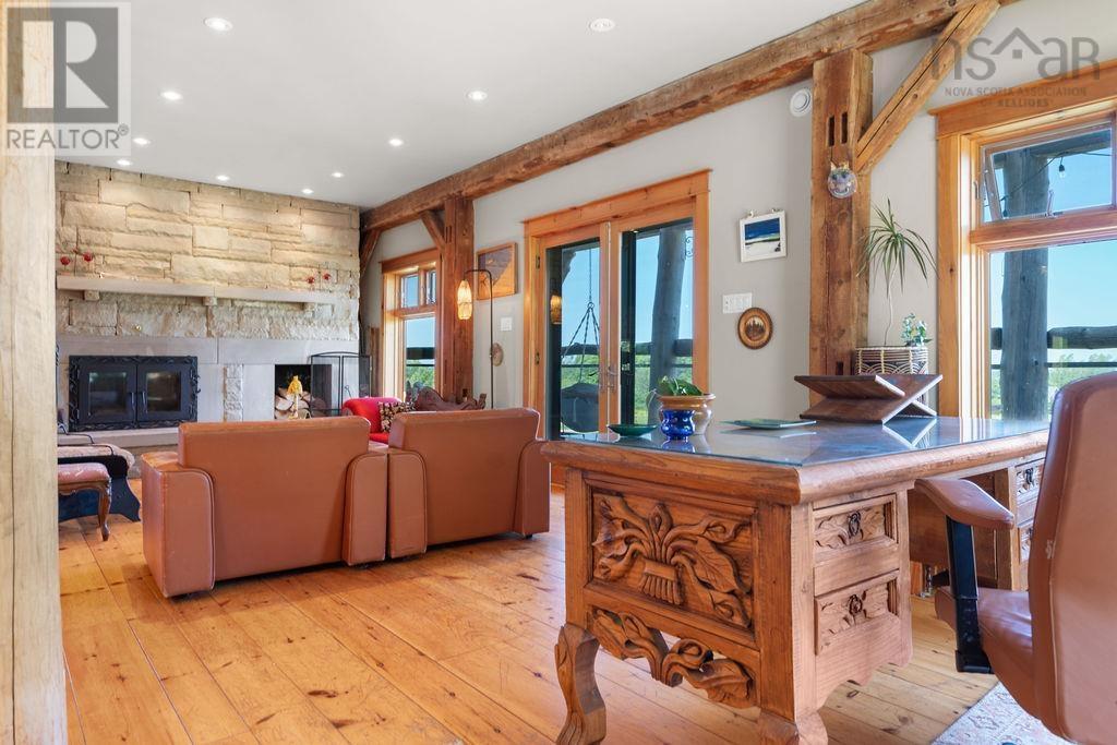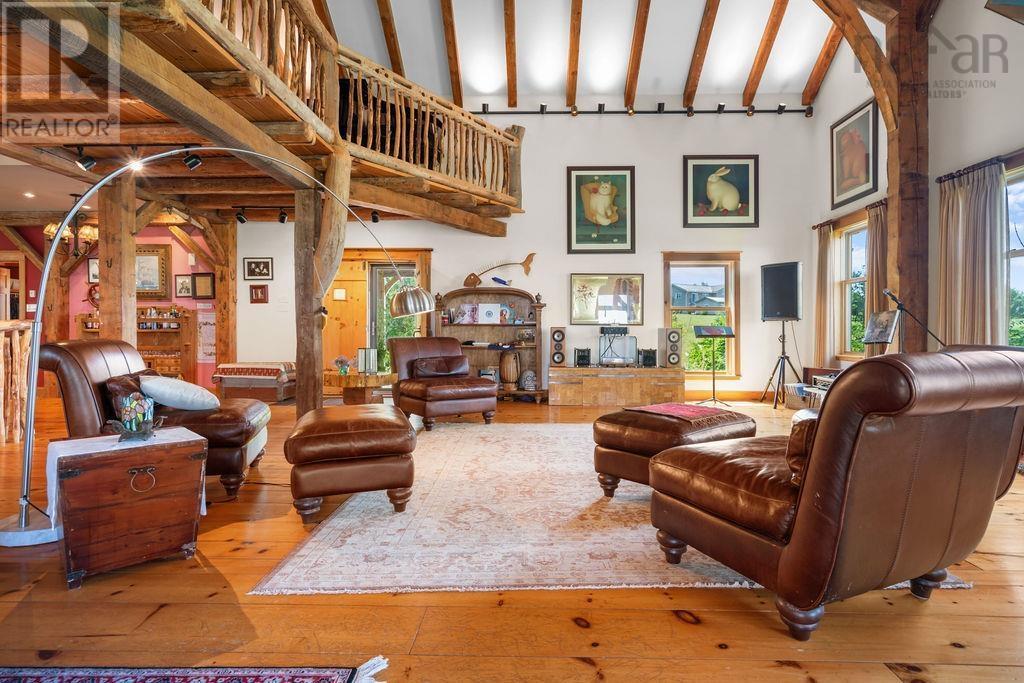 Uncover the unparalleled charm of this extraordinary 4-bedroom + loft, 5-bath timber frame home, meticulously crafted from salvaged barn wood and adorned with beams from historic barns. Central to its design is a majestic white pine tree over a century old, adding a touch of heritage to this architectural gem spanning almost 6,000 square feet. Currently serving as a family residence, this unique property also offers commercial potential. Located near Melmerby Beach and a short drive from Trenton airport, as well as within reach of the international airport and prestigious golf courses, this residence provides a serene escape with convenient access to amenities and attractions. The main level's open concept boasts cathedral ceilings, exposed beams, and exquisite wood floors. The kitchen features soapstone countertops, while a spacious dining room, office, and family room with a grand sandstone fireplace, offer stunning views of the Atlantic. The second floor includes a balcony overlooking the great room and the primary bedroom with a fireplace, walk-in closet, balcony, and lavish ensuite bathroom. The third floor offers another bedroom and sitting area. The lower level encompasses three bedrooms, two baths, a sauna, a games/exercise room, a theater, and multiple fireplaces. Each level's outdoor deck provides ample space for leisure and gatherings. The master bath showcases slate-tiled shower walls for added luxury. With its distinctive attributes, flexible layout, and prime location, this property offers a rare opportunity for those seeking a unique living or business environment. An outdoor fireplace on the main level enhances the property's appeal, creating a cozy setting for outdoor activities and relaxation. With 2.3 acres and access to a lovely beach to moor your boat and swim, enjoy East Coast living. More acreage is available and negotiable. Watch the fishers from your balcony and call them to have lobster delivered to your door. Explore the matterport here. (id:49203)