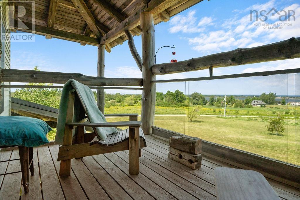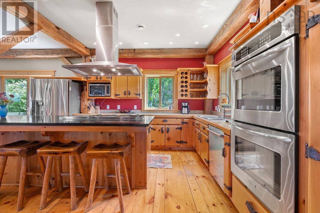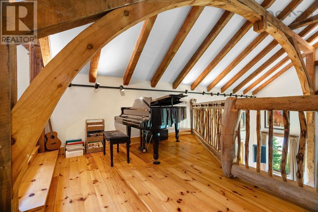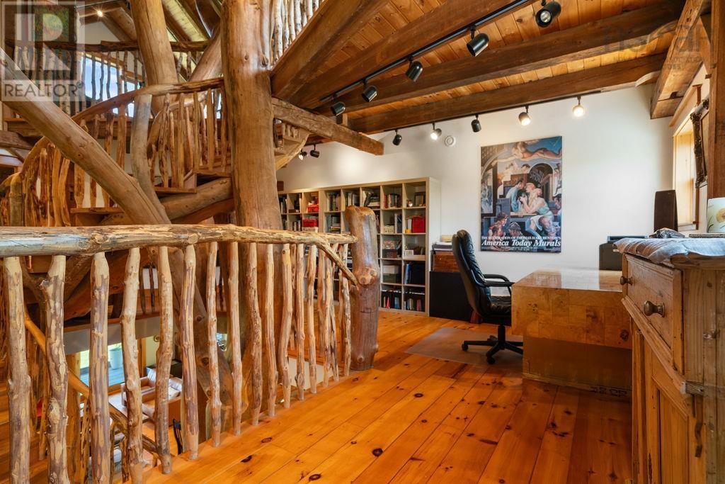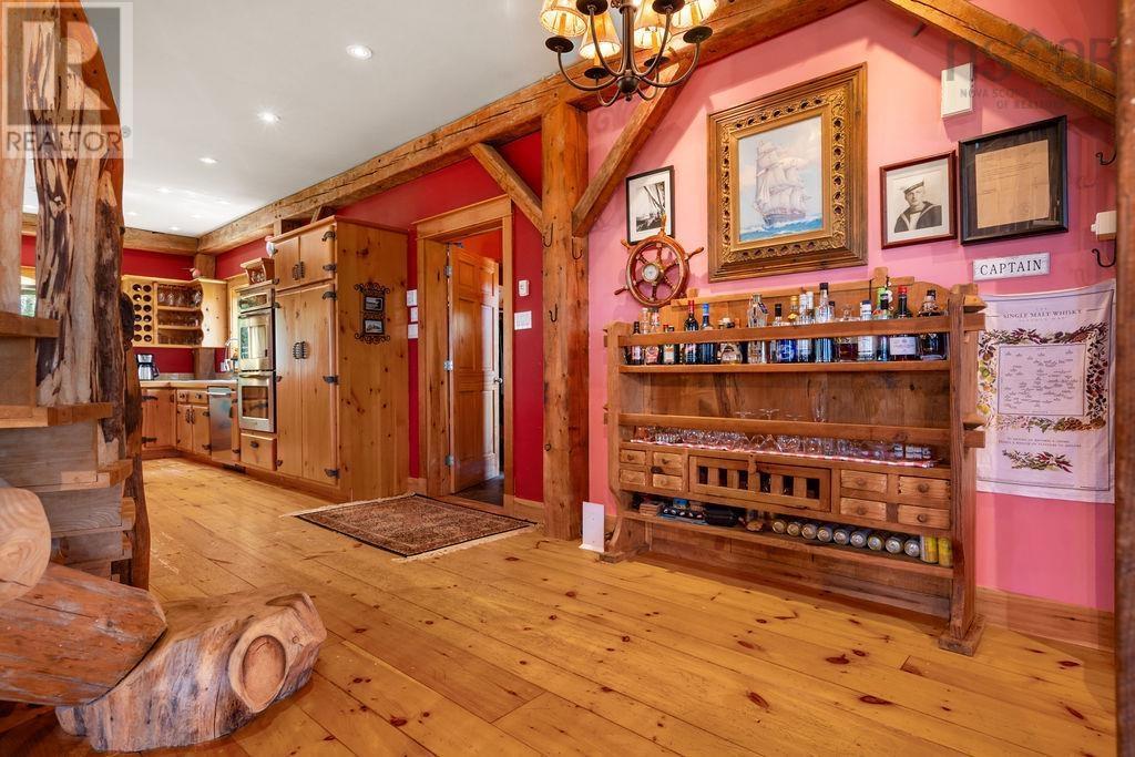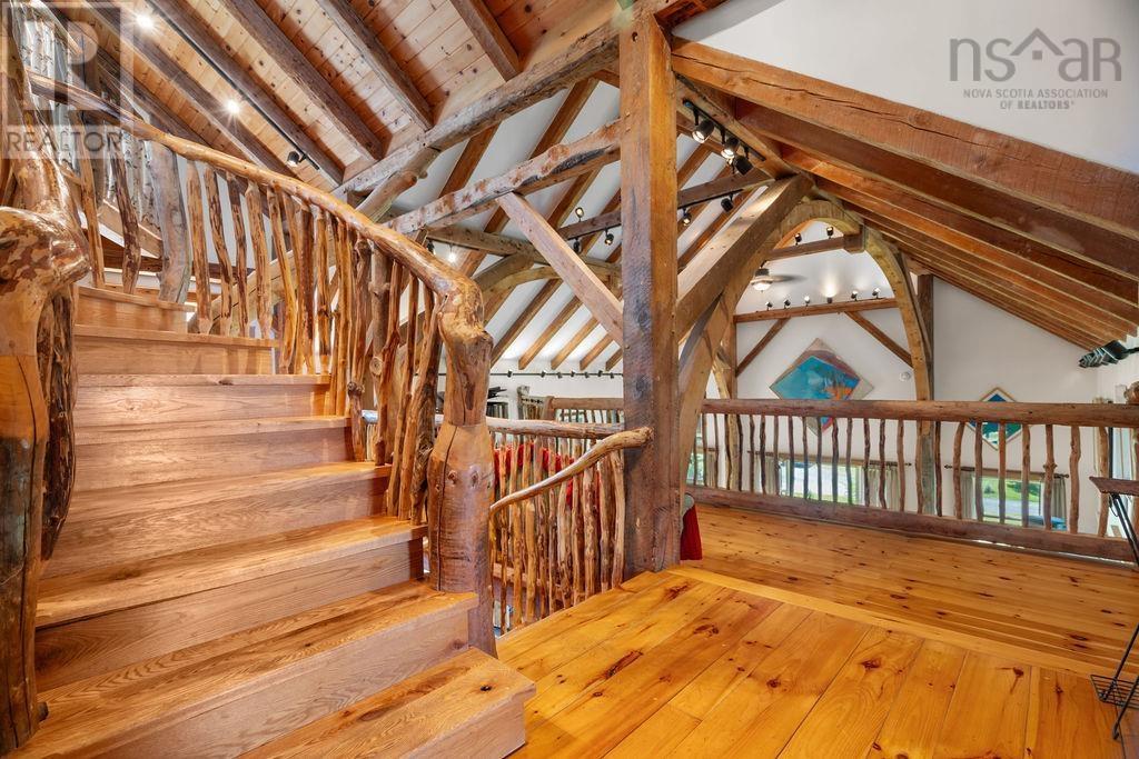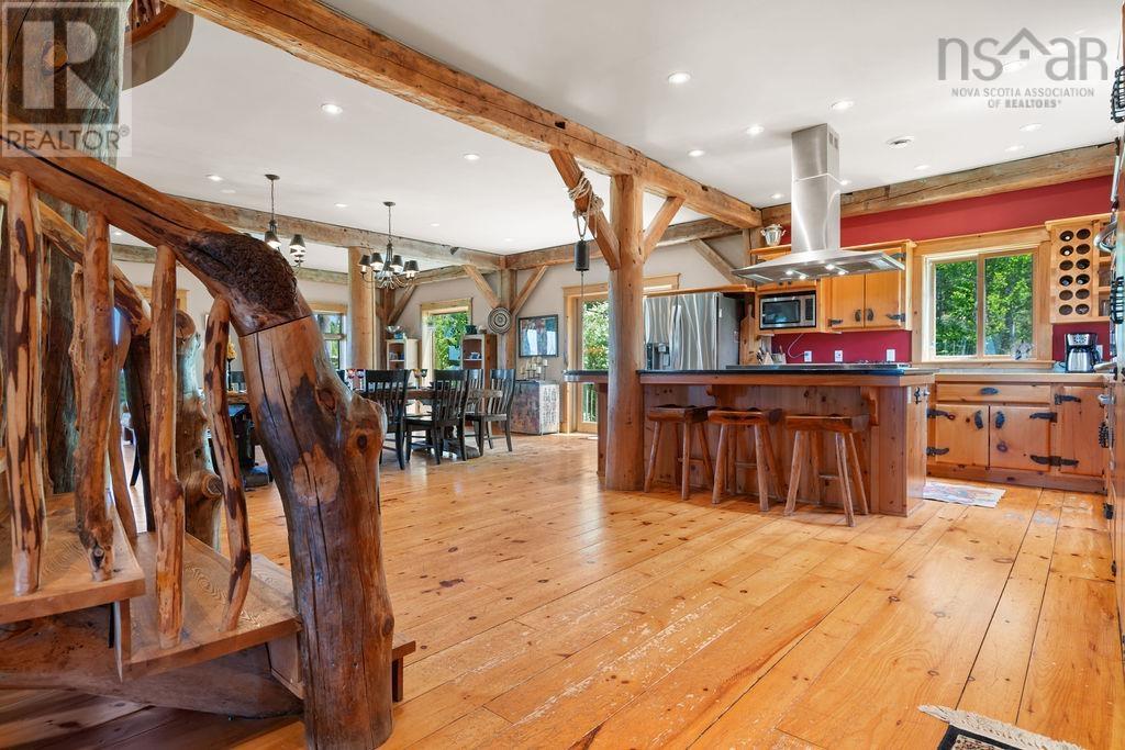 Uncover the unparalleled charm of this extraordinary 4-bedroom + loft, 5-bath timber frame home, meticulously crafted from salvaged barn wood and adorned with beams from historic barns. Central to its design is a majestic white pine tree over a century old, adding a touch of heritage to this architectural gem spanning almost 6,000 square feet. Currently serving as a family residence, this unique property also offers commercial potential. Located near Melmerby Beach and a short drive from Trenton airport, as well as within reach of the international airport and prestigious golf courses, this residence provides a serene escape with convenient access to amenities and attractions. The main level's open concept boasts cathedral ceilings, exposed beams, and exquisite wood floors. The kitchen features soapstone countertops, while a spacious dining room, office, and family room with a grand sandstone fireplace, offer stunning views of the Atlantic. The second floor includes a balcony overlooking the great room and the primary bedroom with a fireplace, walk-in closet, balcony, and lavish ensuite bathroom. The third floor offers another bedroom and sitting area. The lower level encompasses three bedrooms, two baths, a sauna, a games/exercise room, a theater, and multiple fireplaces. Each level's outdoor deck provides ample space for leisure and gatherings. The master bath showcases slate-tiled shower walls for added luxury. With its distinctive attributes, flexible layout, and prime location, this property offers a rare opportunity for those seeking a unique living or business environment. An outdoor fireplace on the main level enhances the property's appeal, creating a cozy setting for outdoor activities and relaxation. With 2.3 acres and access to a lovely beach to moor your boat and swim, enjoy East Coast living. More acreage is available and negotiable. Watch the fishers from your balcony and call them to have lobster delivered to your door. Explore the matterport here. (id:49203)