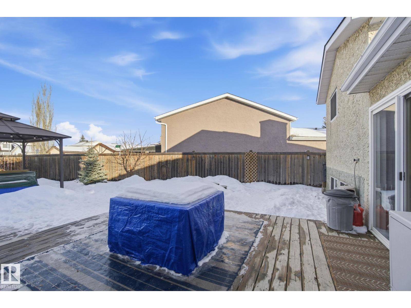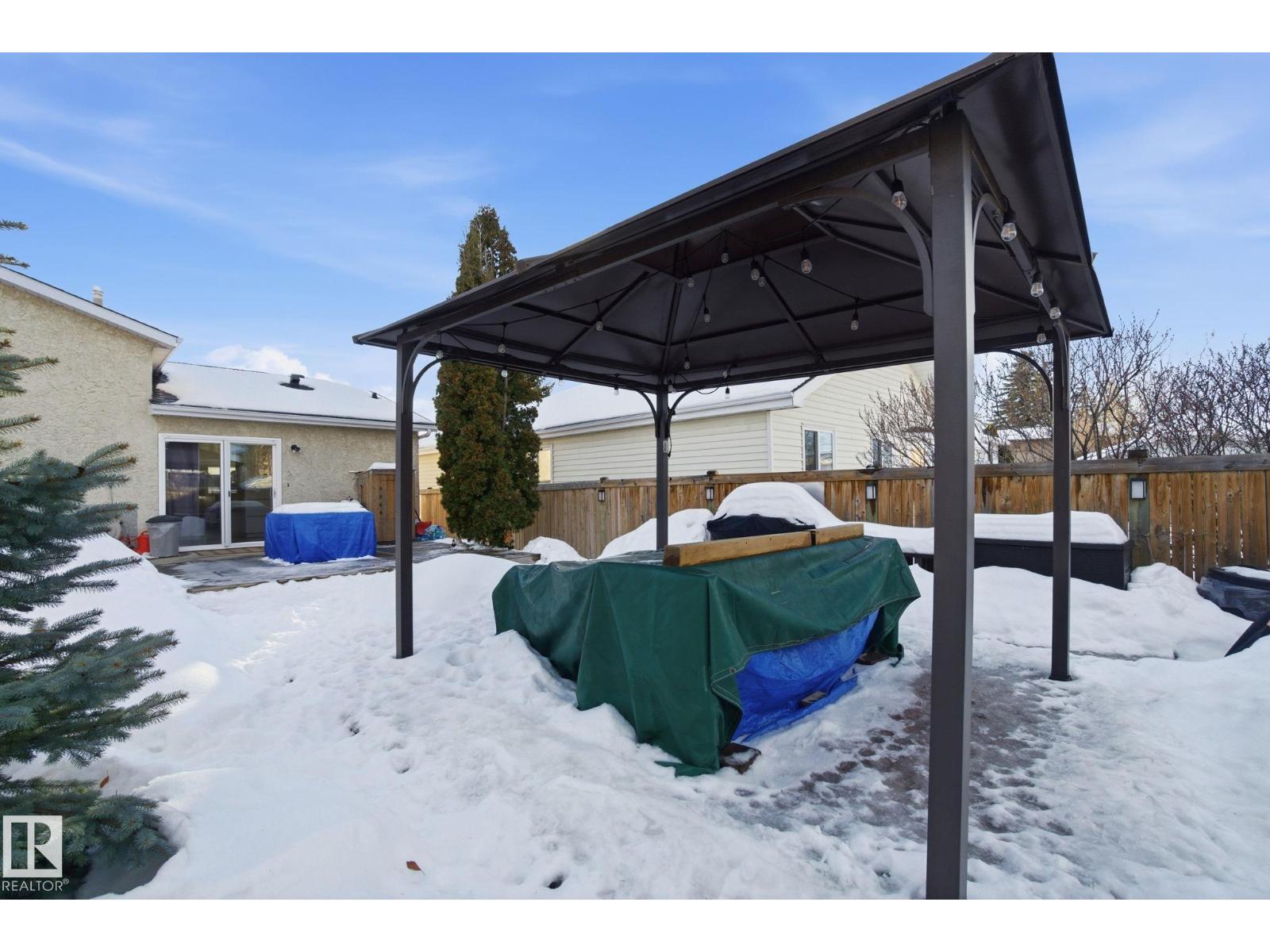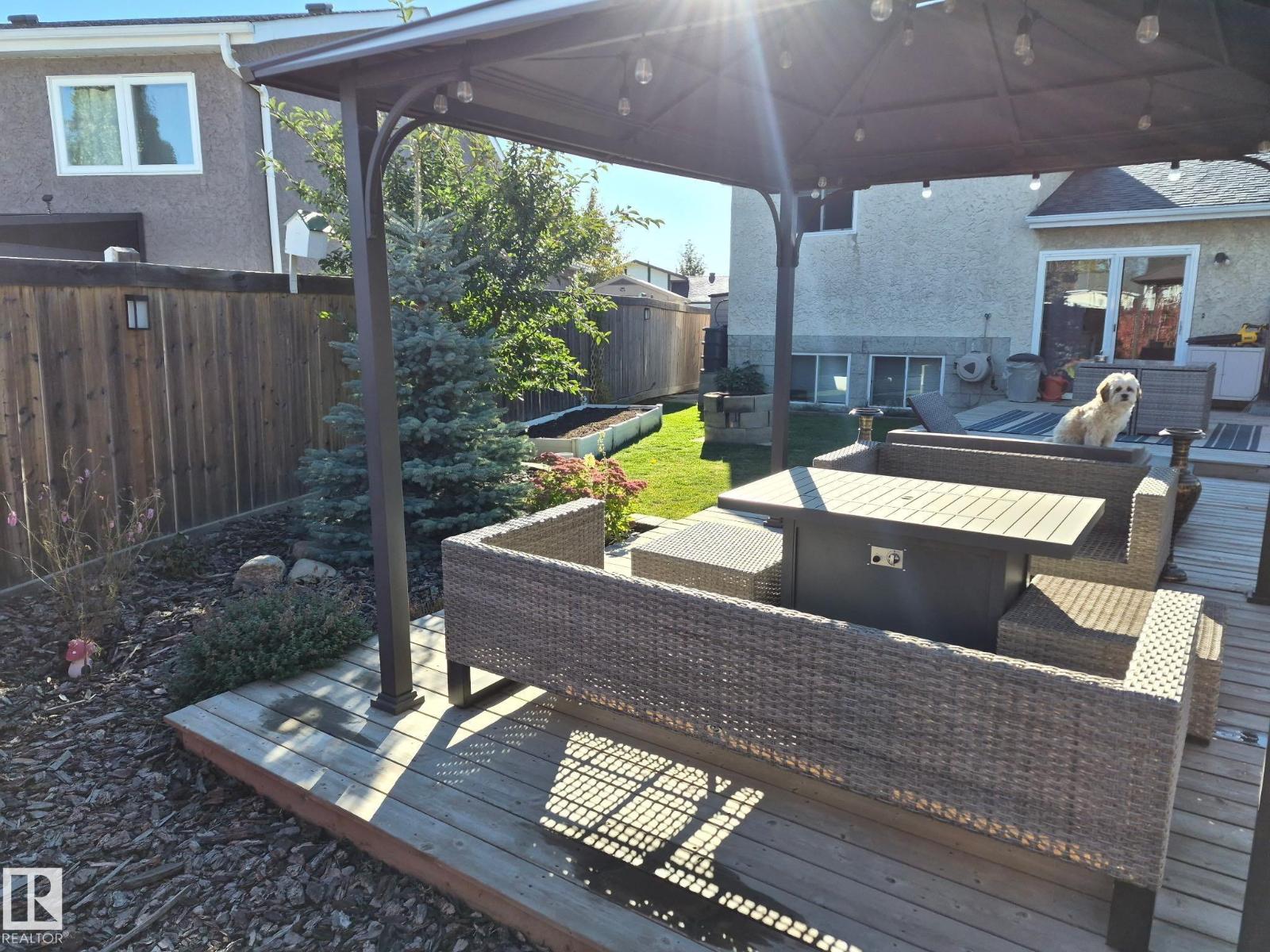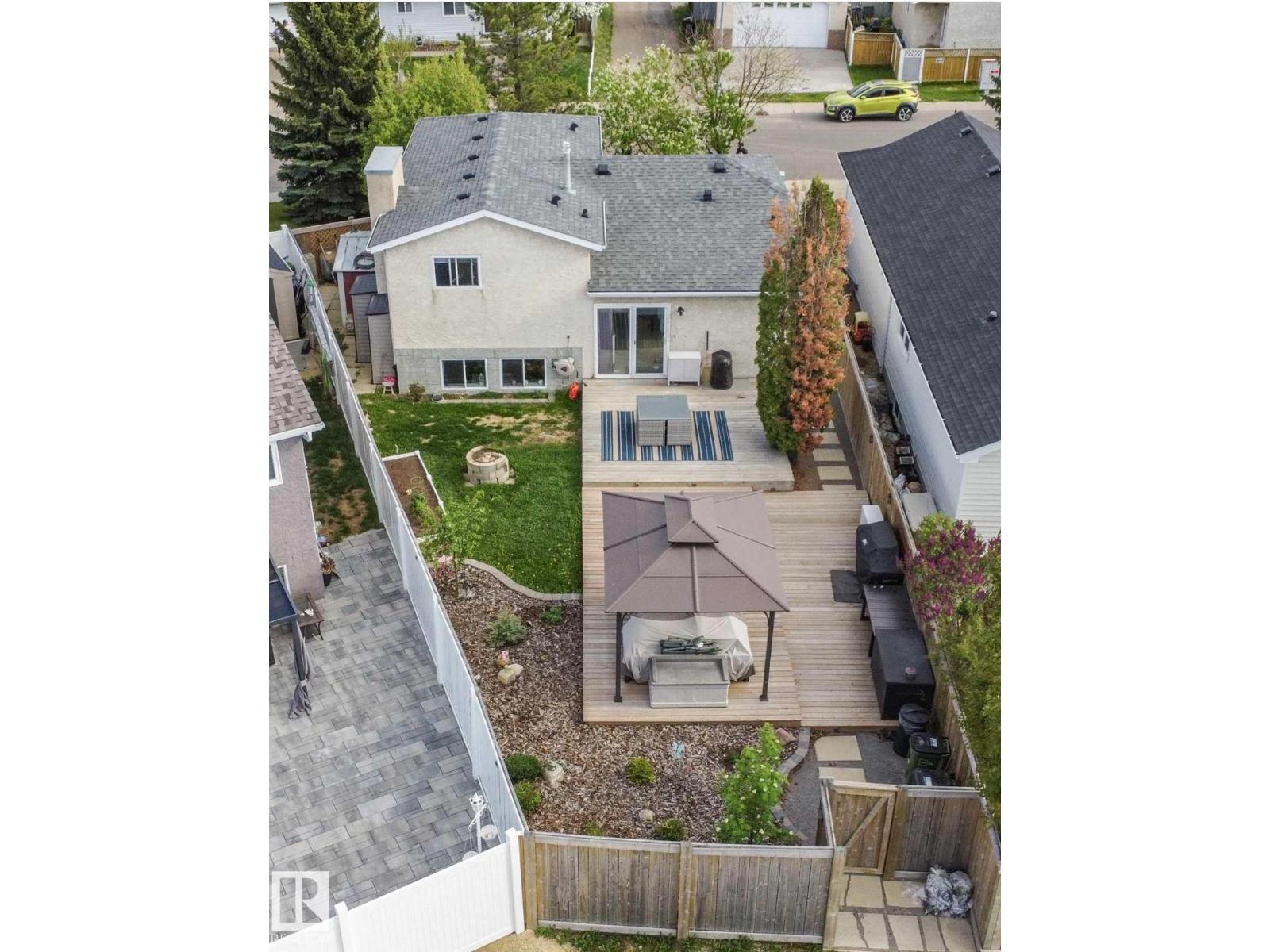 Welcome to this bright and inviting 4-bed, 3-bath home, lovingly maintained with recent updates including a high-efficiency furnace, shingles, fresh appliances, vinyl windows, stylish front door and rear sliding patio doors. Enjoy central A/C, top-down window coverings, and blackout shades in the bedrooms. The kitchen shines with a well-organized pantry (roll-out shelves), built-in prep counter with mini fridge, and glass upper display cabinets. Step outside to your backyard retreat featuring a tiered deck, gazebo with bistro lighting, gas line ready for your BBQ and fire table, multiple sheds, water barrel, raised garden beds, fire pit, and mature trees. Bonus: A 20x20 garage permit was previously approved by the City of Edmonton—ideal for future expansion! Nestled in a peaceful community with unbeatable location—minutes from Lymburn Elementary, quick access to Anthony Henday and Whitemud, 5 min to YMCA, and under 10 min to West Edmonton Mall. Everything you need is right at your fingertips! 10/10! (id:49203)