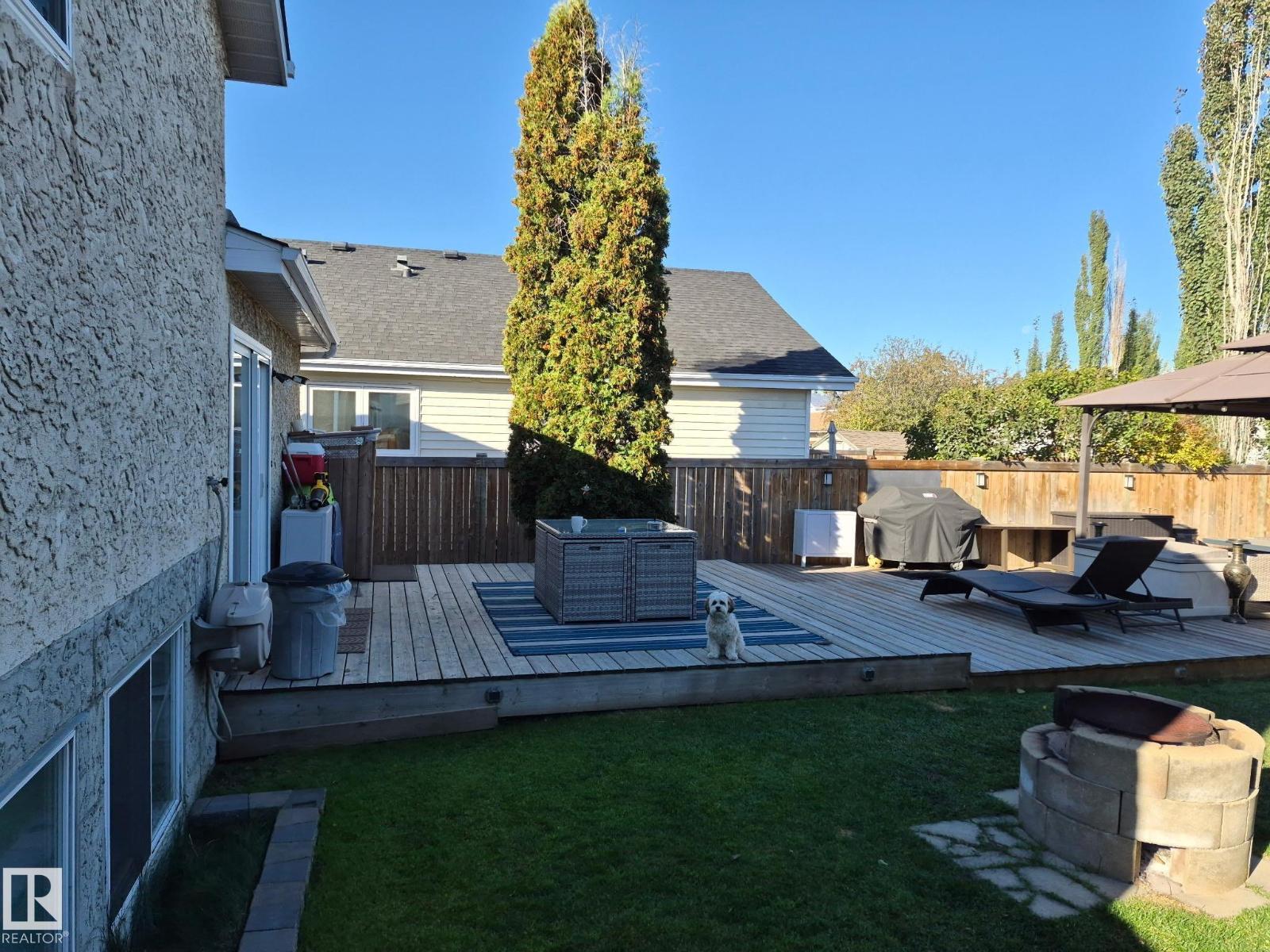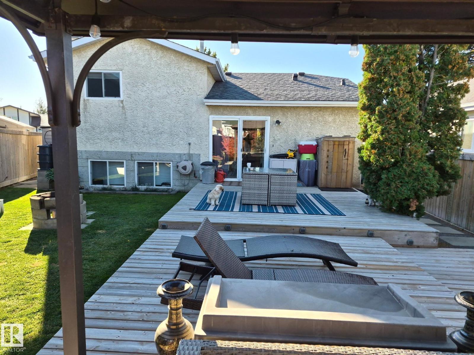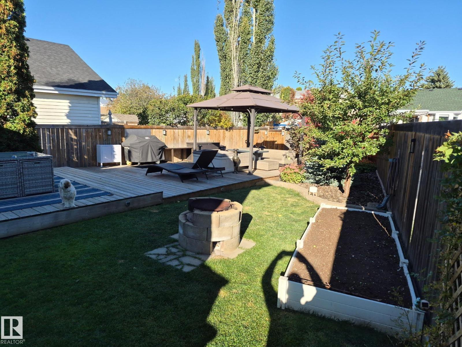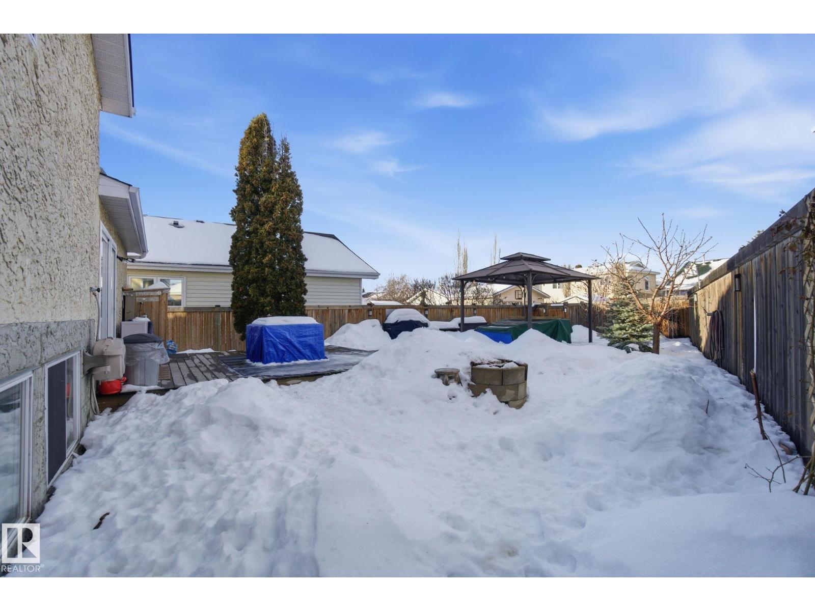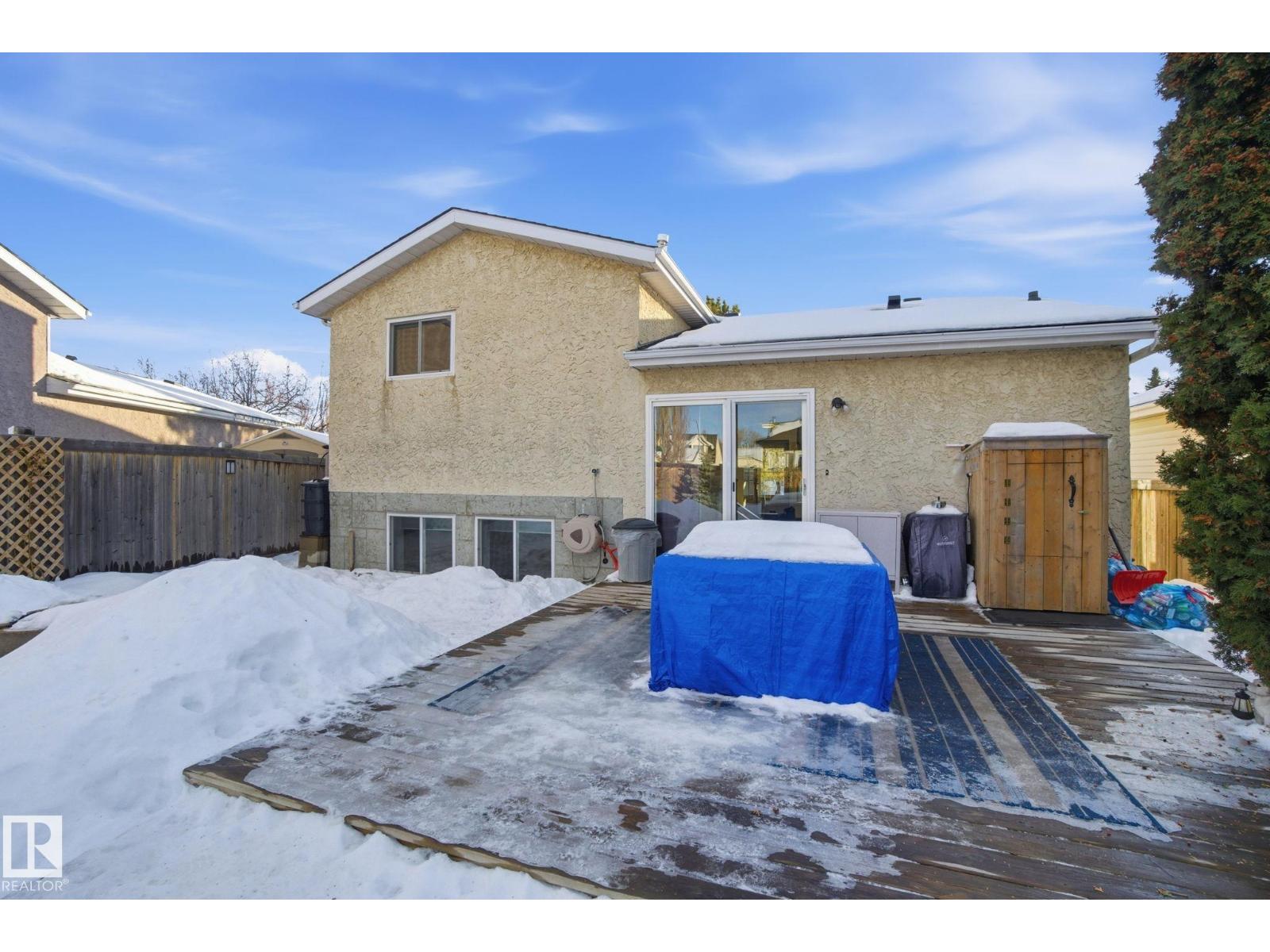 Welcome to this bright and inviting 4-bed, 3-bath home, lovingly maintained with recent updates including a high-efficiency furnace, shingles, fresh appliances, vinyl windows, stylish front door and rear sliding patio doors. Enjoy central A/C, top-down window coverings, and blackout shades in the bedrooms. The kitchen shines with a well-organized pantry (roll-out shelves), built-in prep counter with mini fridge, and glass upper display cabinets. Step outside to your backyard retreat featuring a tiered deck, gazebo with bistro lighting, gas line ready for your BBQ and fire table, multiple sheds, water barrel, raised garden beds, fire pit, and mature trees. Bonus: A 20x20 garage permit was previously approved by the City of Edmonton—ideal for future expansion! Nestled in a peaceful community with unbeatable location—minutes from Lymburn Elementary, quick access to Anthony Henday and Whitemud, 5 min to YMCA, and under 10 min to West Edmonton Mall. Everything you need is right at your fingertips! 10/10! (id:49203)