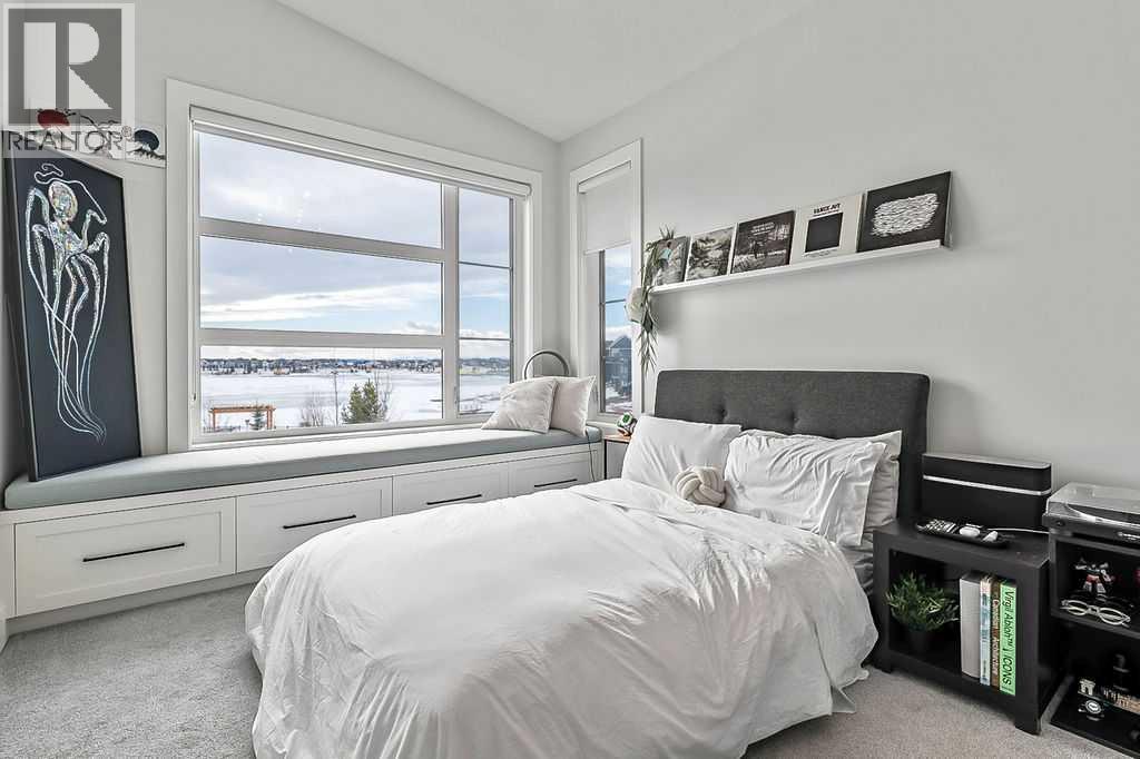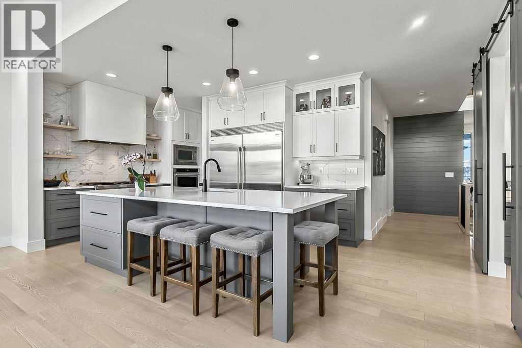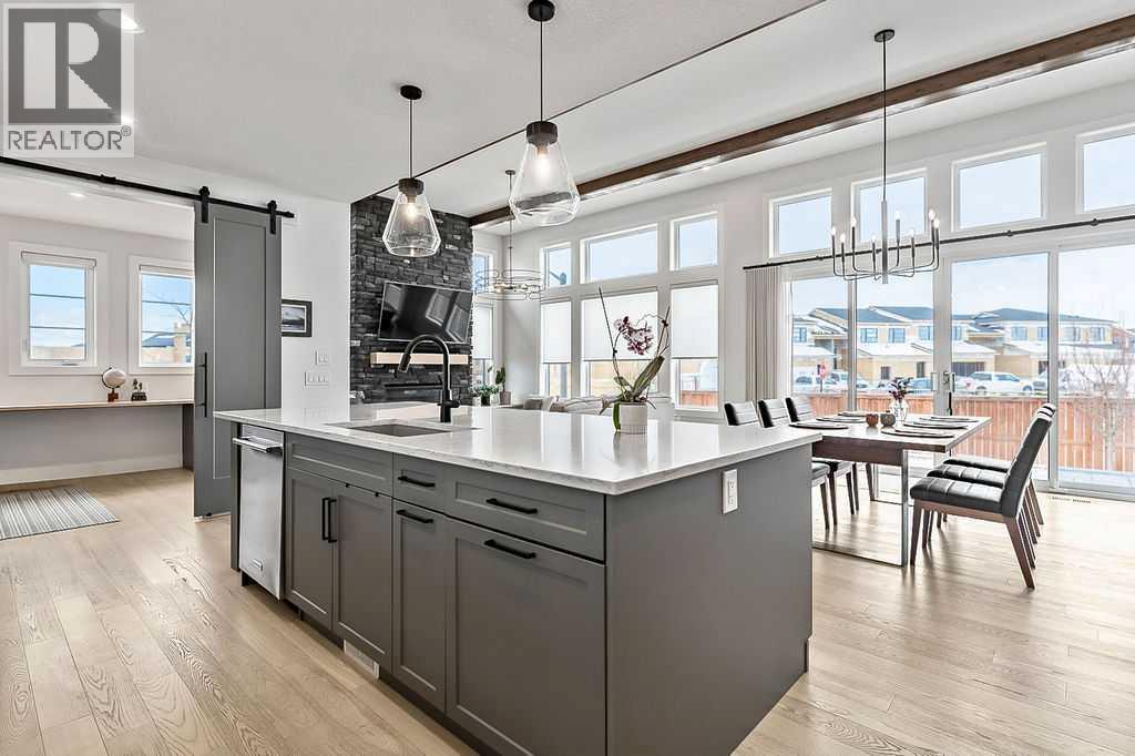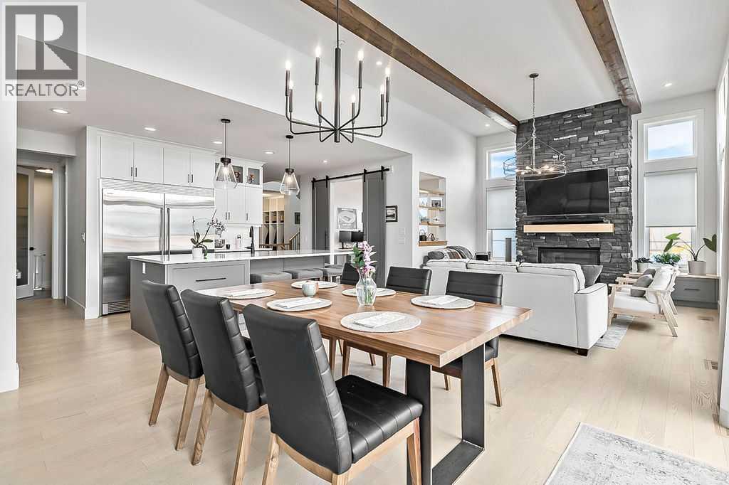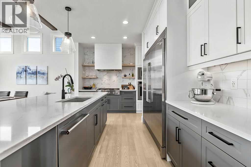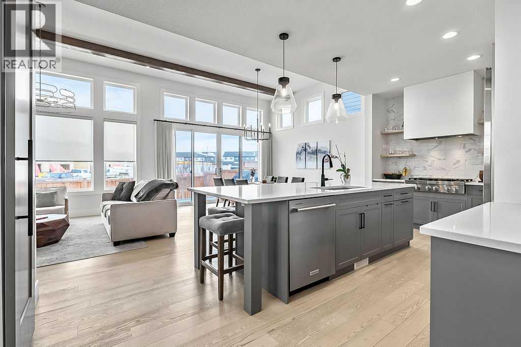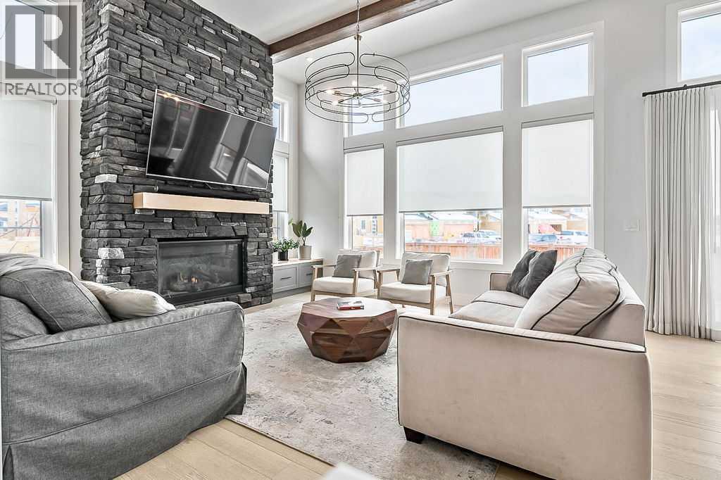 Exceptional residence on an OVERSIZED CORNER LOT WITH GORGEOUS LAKE VIEWS. Thoughtful professional design aspects and upgrades throughout the home result in 3,500 sq. ft. of beautiful developed space, including a fully finished basement. This is the ultimate family home designed for both everyday comfort and elevated entertaining. The open concept design seamlessly connects the living, dining and kitchen spaces and features walls of floor to ceiling windows that flood the home with natural light. The chef inspired kitchen is a true showpiece, featuring high end appliances including a double fridge/freezer, 6 burner gas cooktop, built-in oven, custom hood fan, walk-in pantry and an ultra convenient butler’s pantry. The spacious dining area opens through patio doors to a custom tiered stone patio, fully landscaped and fenced yard. The living room, complete with floor to ceiling 16’ stone fireplace, beamed ceiling, STUNNING WINDOWSCAPING and built-in window seating is sure to create memories with family and friends. A main floor office provides ample space for a work from home set up, while the front entrance features built-in hanging and storage compartments to keep busy family life organized. Upstairs, an open loft with a full wall of windows and patio doors leads to a private BALCONY OVERLOOKING THE LAKE - an ideal retreat for morning coffee or evening relaxation. The primary suite offers an elegant ensuite with dual vanities, a stand alone soaker tub and a generously sized walk in shower with dual shower heads, creating a serene, zen like escape. The secondary bedrooms are equally charming, each featuring cozy built-in window seats. The main bath has an extra long double vanity with abundant storage. The fully developed basement continues the home’s thoughtful design, featuring a spacious family room with a fireplace feature wall, built-in over sized wet bar with sink and beverage fridge, a fourth bedroom, full bathroom and a laundry room - perfect for guests, teens, or multi-generational living. This perfect family home also has a heated double garage as an added bonus. Harmony is an exceptional award winning community with two private lakes, a Phil Mickelson world class golf course, miles of biking and walking trails, greenspace, easy access to downtown Calgary and the Rocky Mountains. (id:49203)