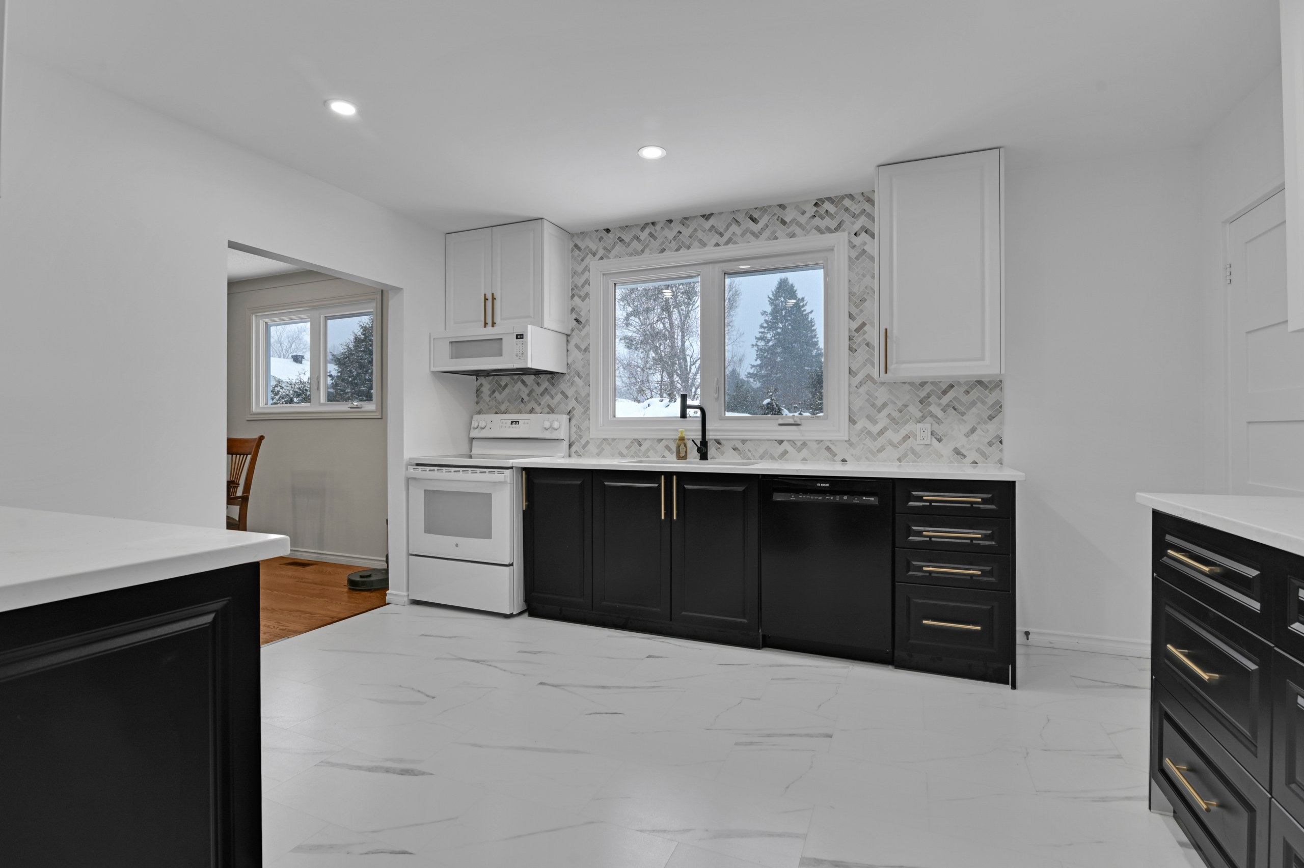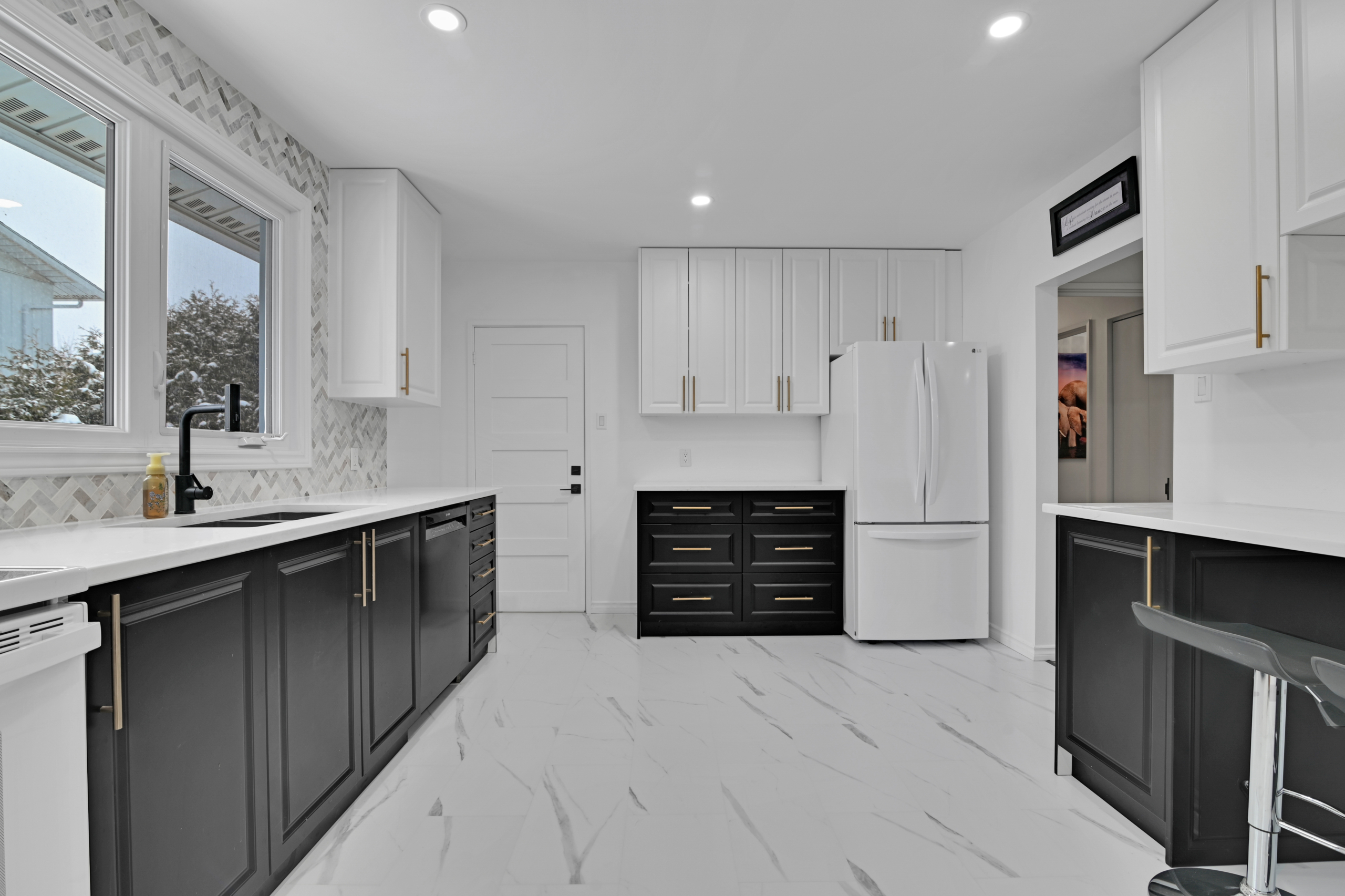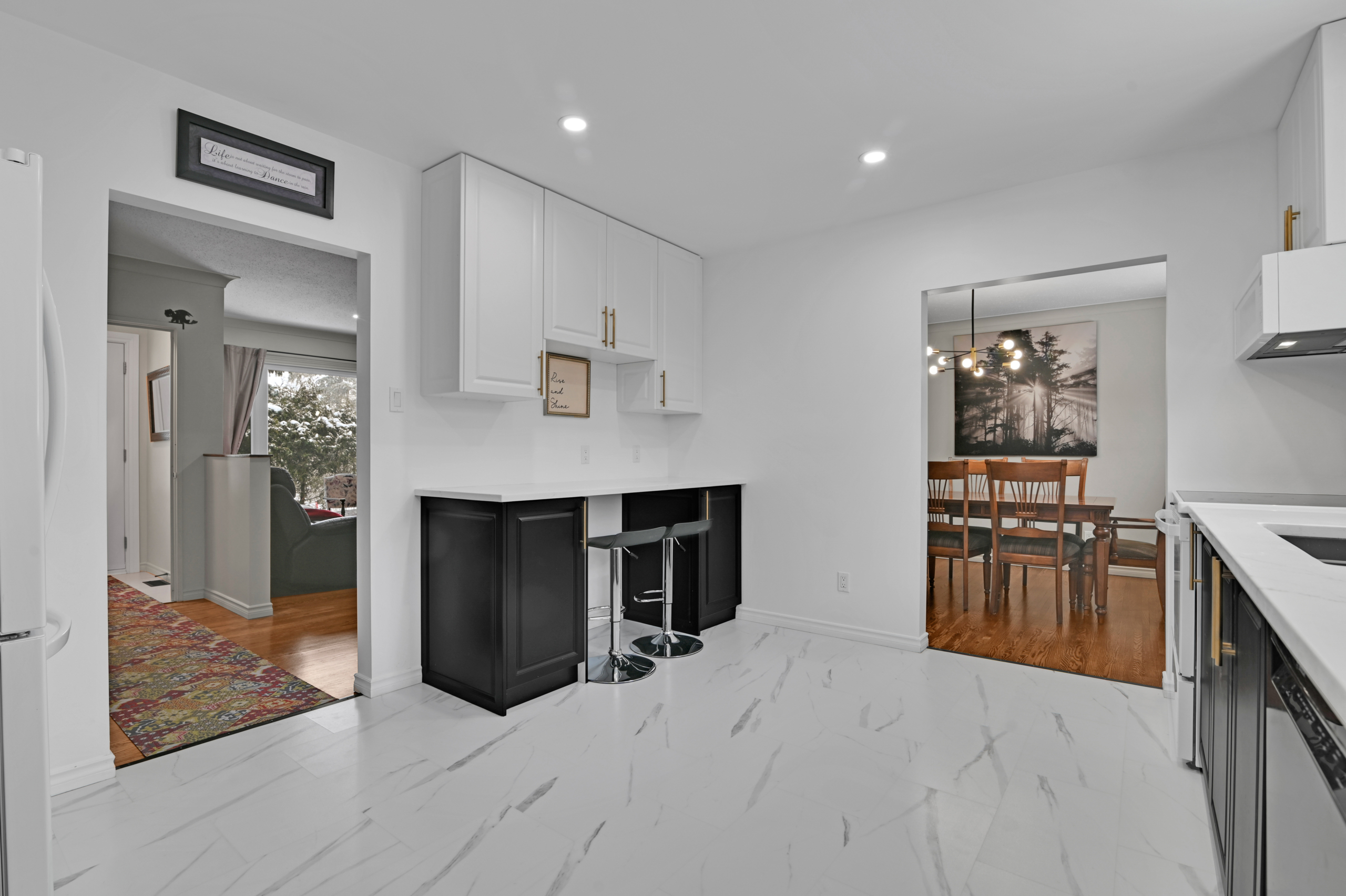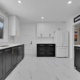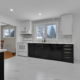 • Hit the market 749K 28 Carbrooke, Kanata 613-867-6058 together@dekkerteam.com A modern kitchen with white cabinets, black lower cabinets, a black stove, and a white refrigerator.