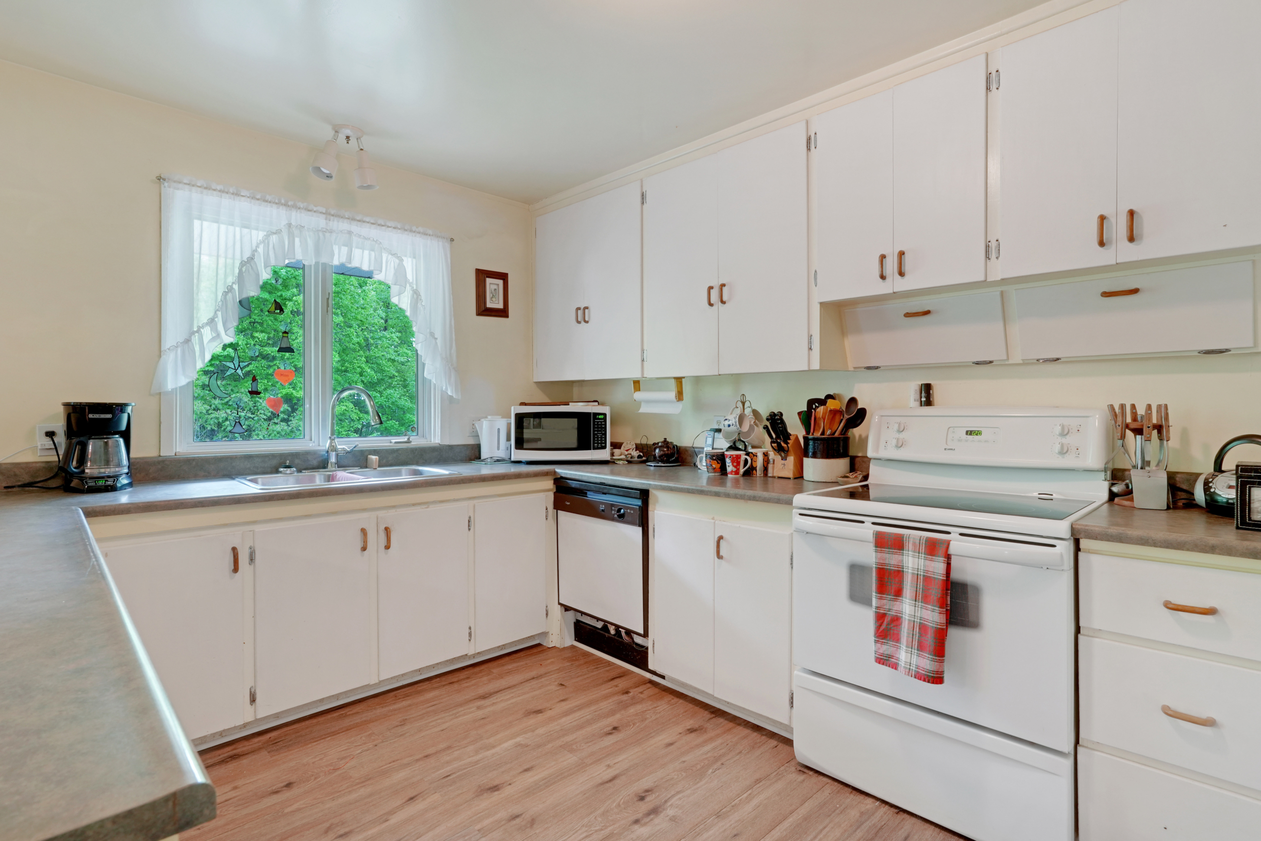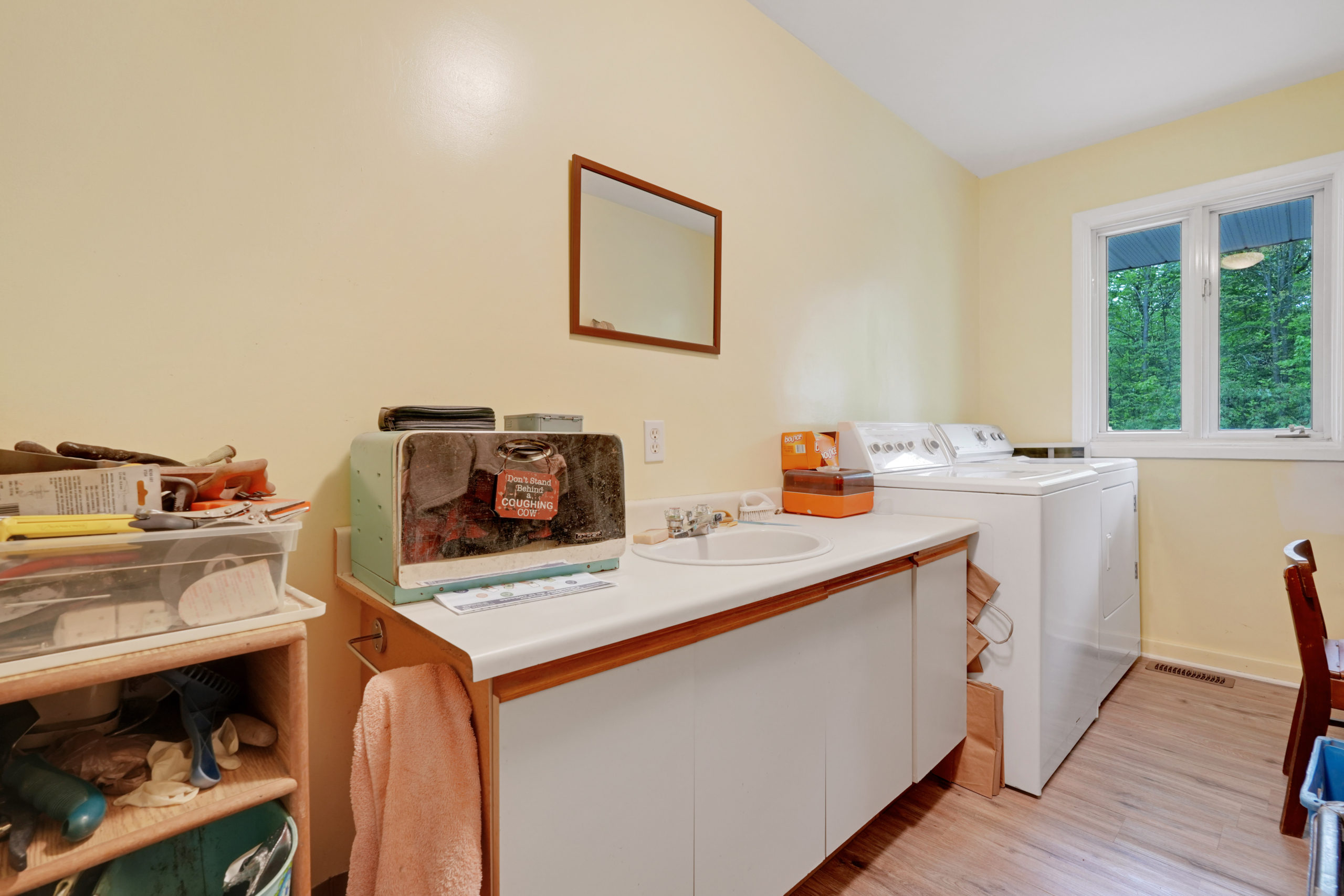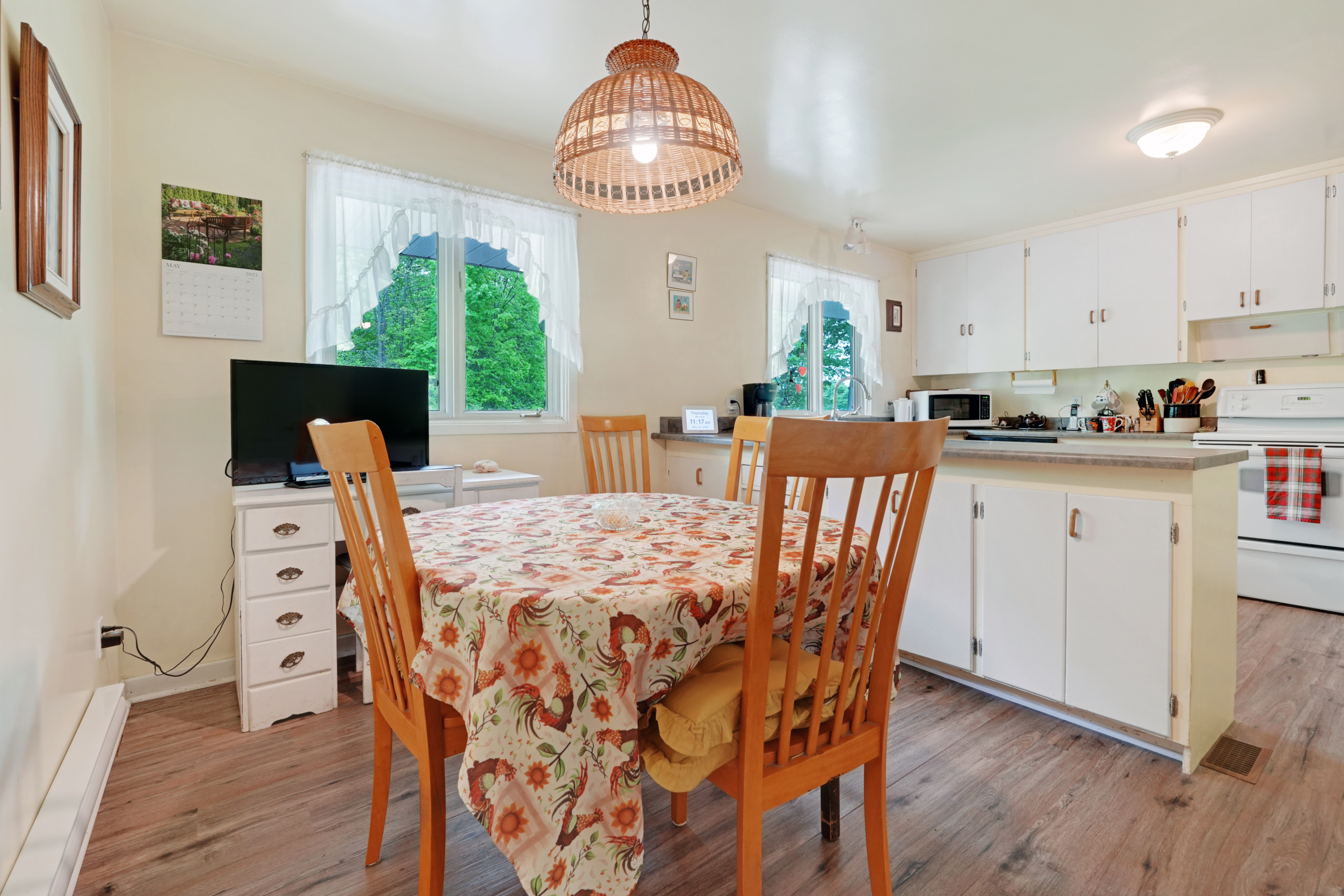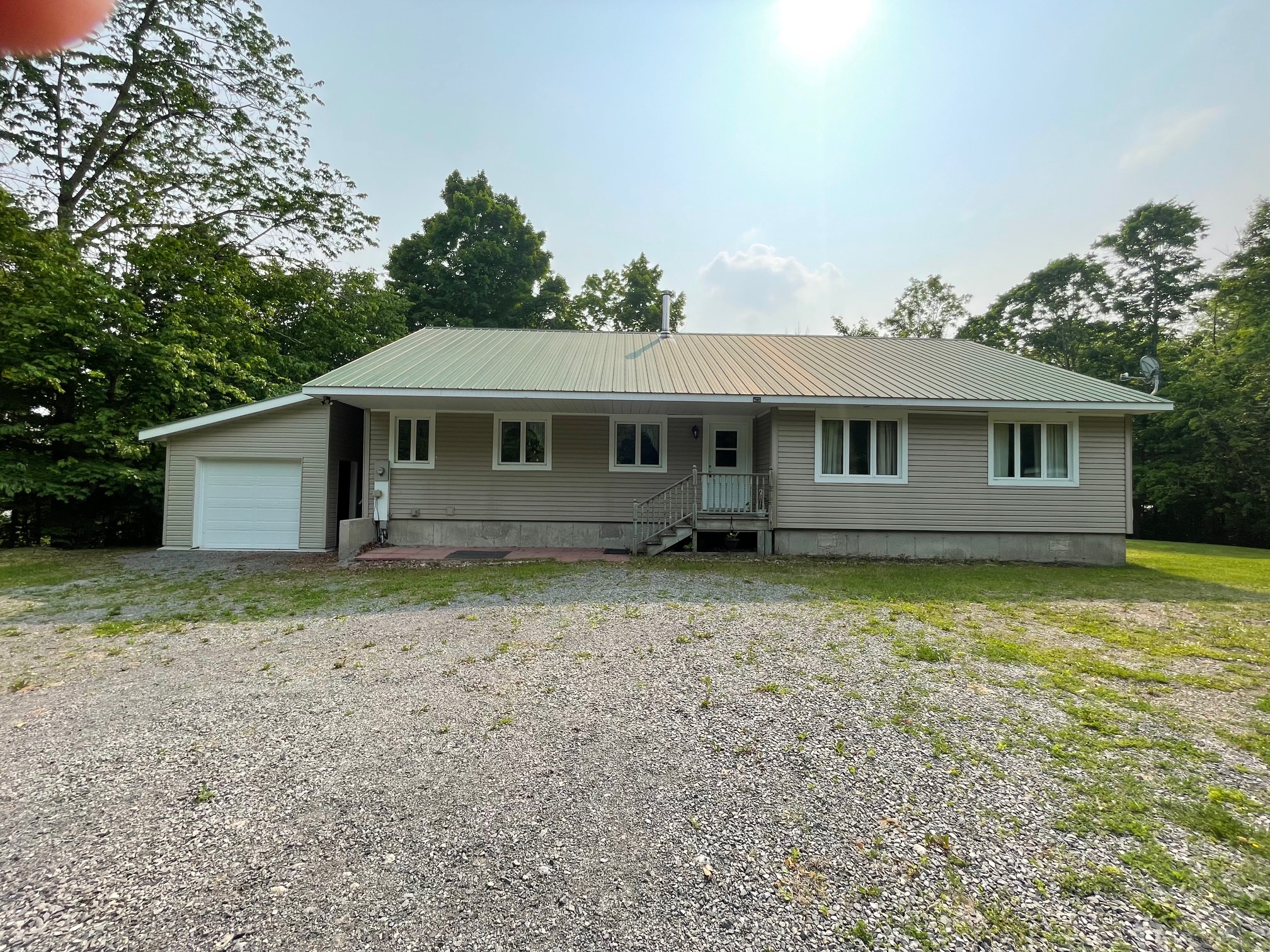 Spacious 4-bedroom, 2-bath bungalow set on over 11 acres in the quiet village of Vernon with potential to develop the land into a small subdivision. The main floor features a large primary bedroom with a double-door closet, 2-piece ensuite, and a picture window overlooking the trees. Bright eat-in kitchen with ample storage and a large window facing the private backyard with no rear neighbors. Enjoy easy main floor living with laundry, two additional bedrooms, and no carpet. The sunlit dining room leads into a generous living space and a charming enclosed sunroom with warm wood finishes. Downstairs includes a fourth bedroom, potential office, and a large unfinished area perfect for storage or future expansion. Metal roof, attached garage, and wide gravel driveway. Peaceful setting with space to grow. Ideal for multi-generational living or buyers seeking privacy and long-term potential.
