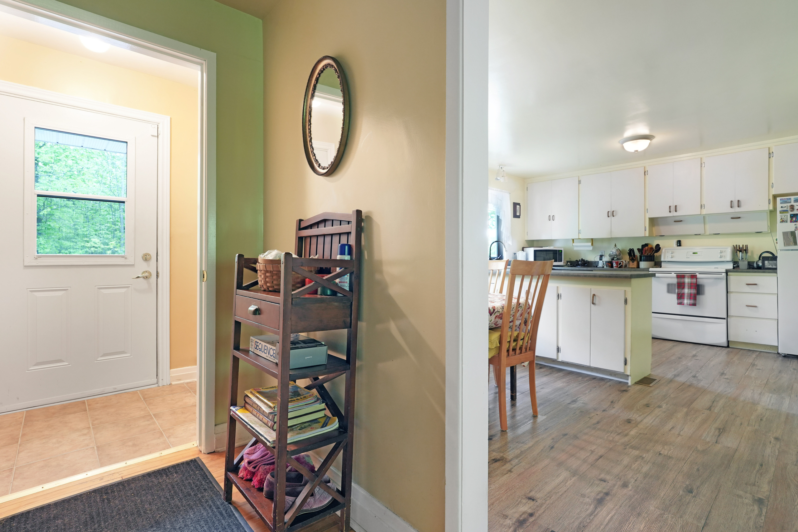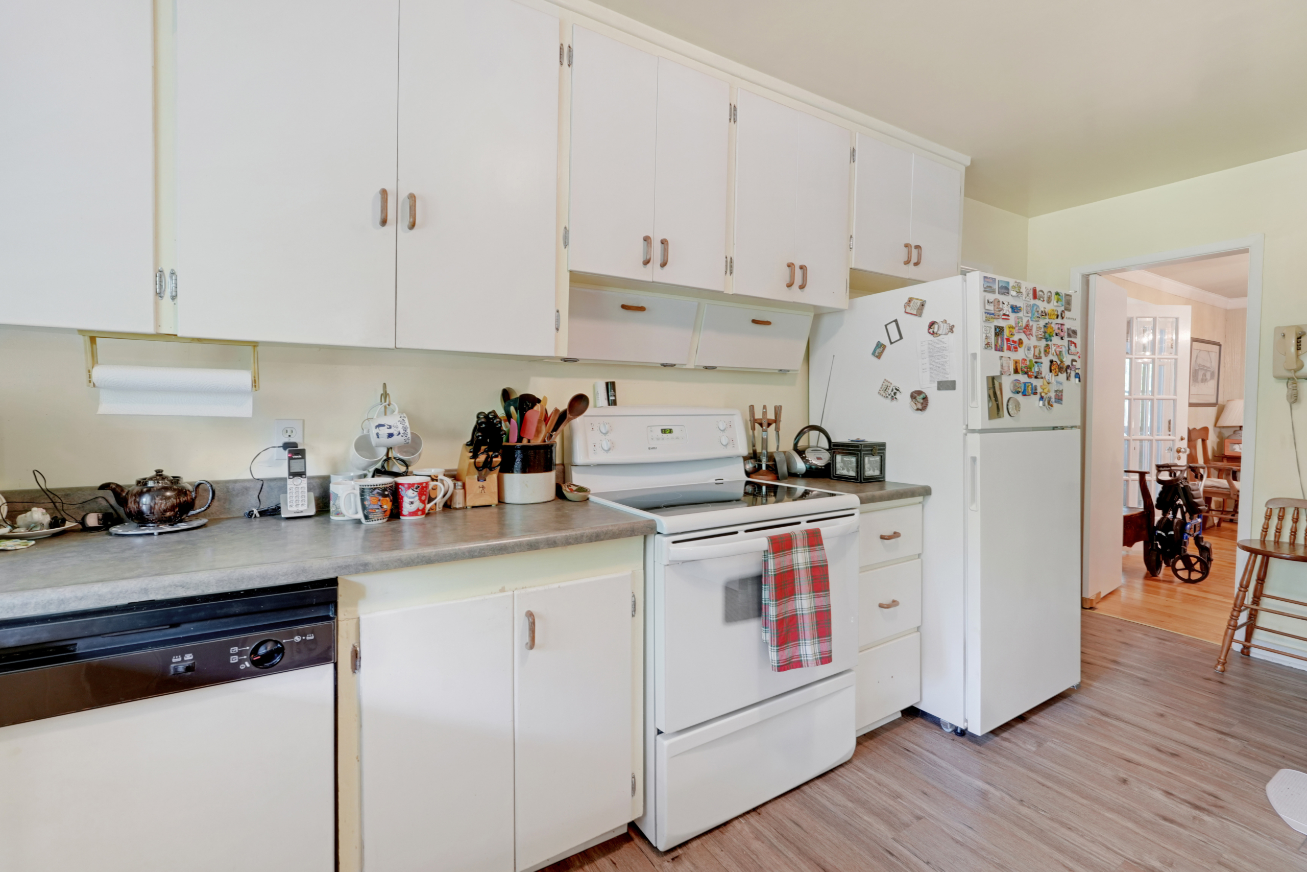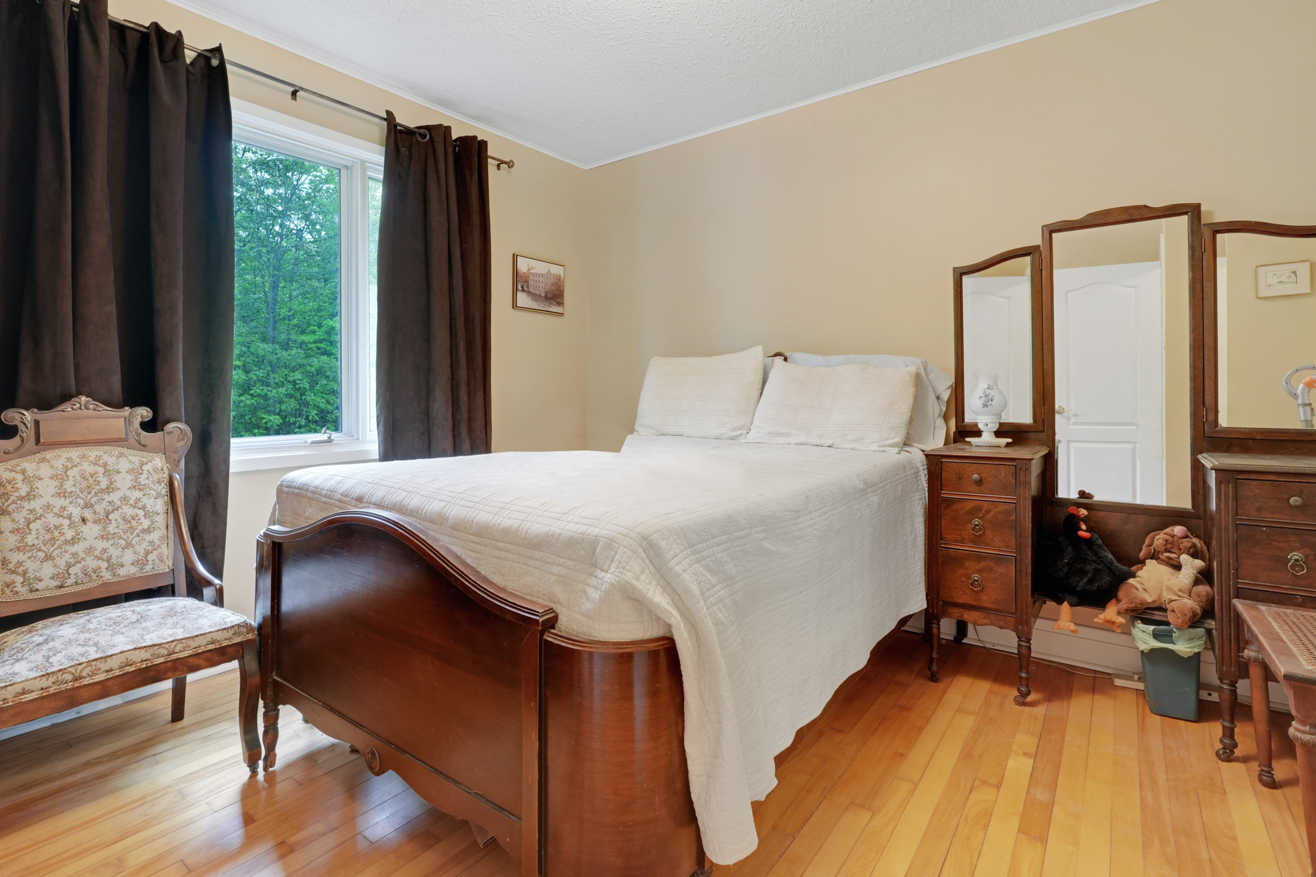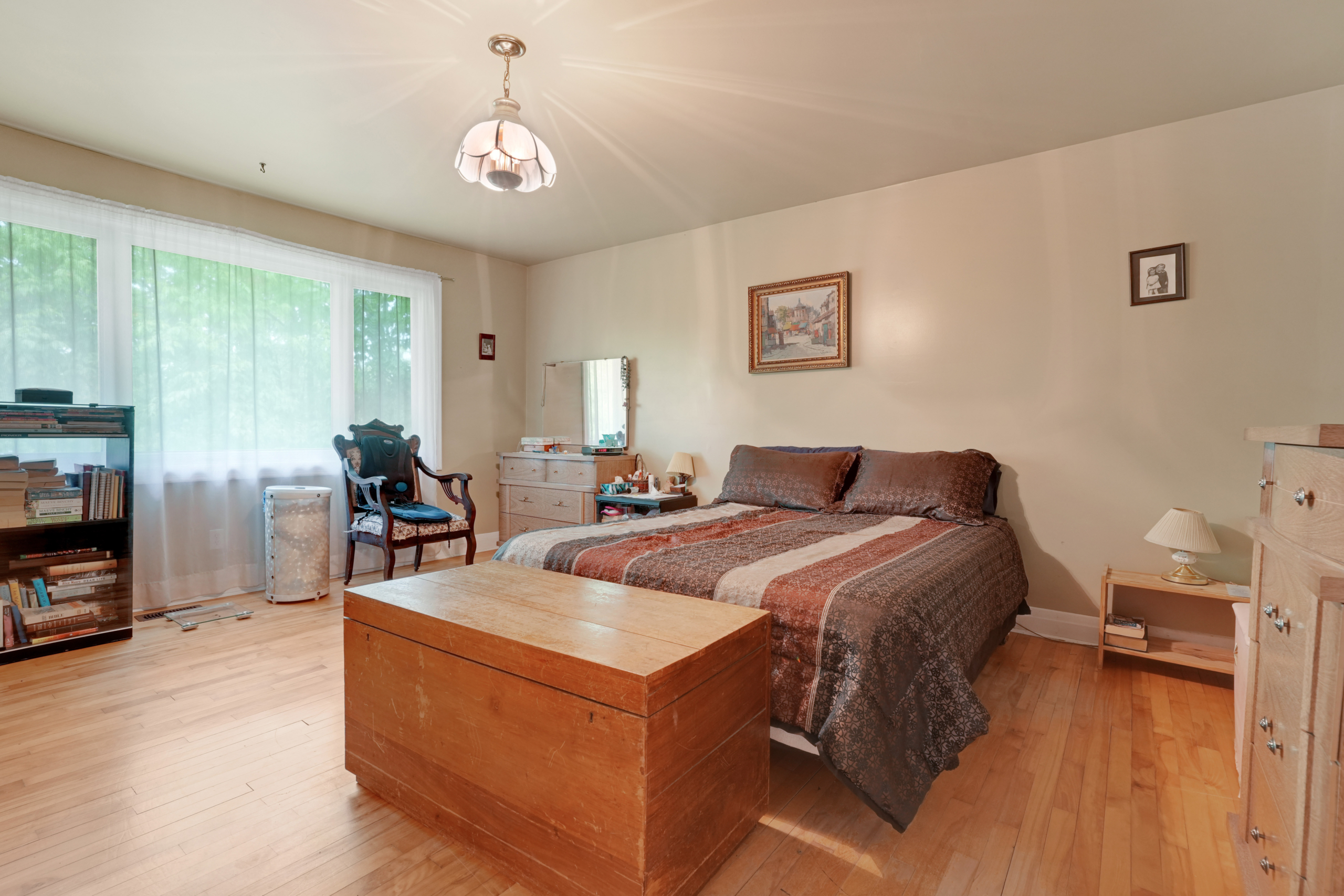 Spacious 4-bedroom, 2-bath bungalow set on over 11 acres in the quiet village of Vernon with potential to develop the land into a small subdivision. The main floor features a large primary bedroom with a double-door closet, 2-piece ensuite, and a picture window overlooking the trees. Bright eat-in kitchen with ample storage and a large window facing the private backyard with no rear neighbors. Enjoy easy main floor living with laundry, two additional bedrooms, and no carpet. The sunlit dining room leads into a generous living space and a charming enclosed sunroom with warm wood finishes. Downstairs includes a fourth bedroom, potential office, and a large unfinished area perfect for storage or future expansion. Metal roof, attached garage, and wide gravel driveway. Peaceful setting with space to grow. Ideal for multi-generational living or buyers seeking privacy and long-term potential.